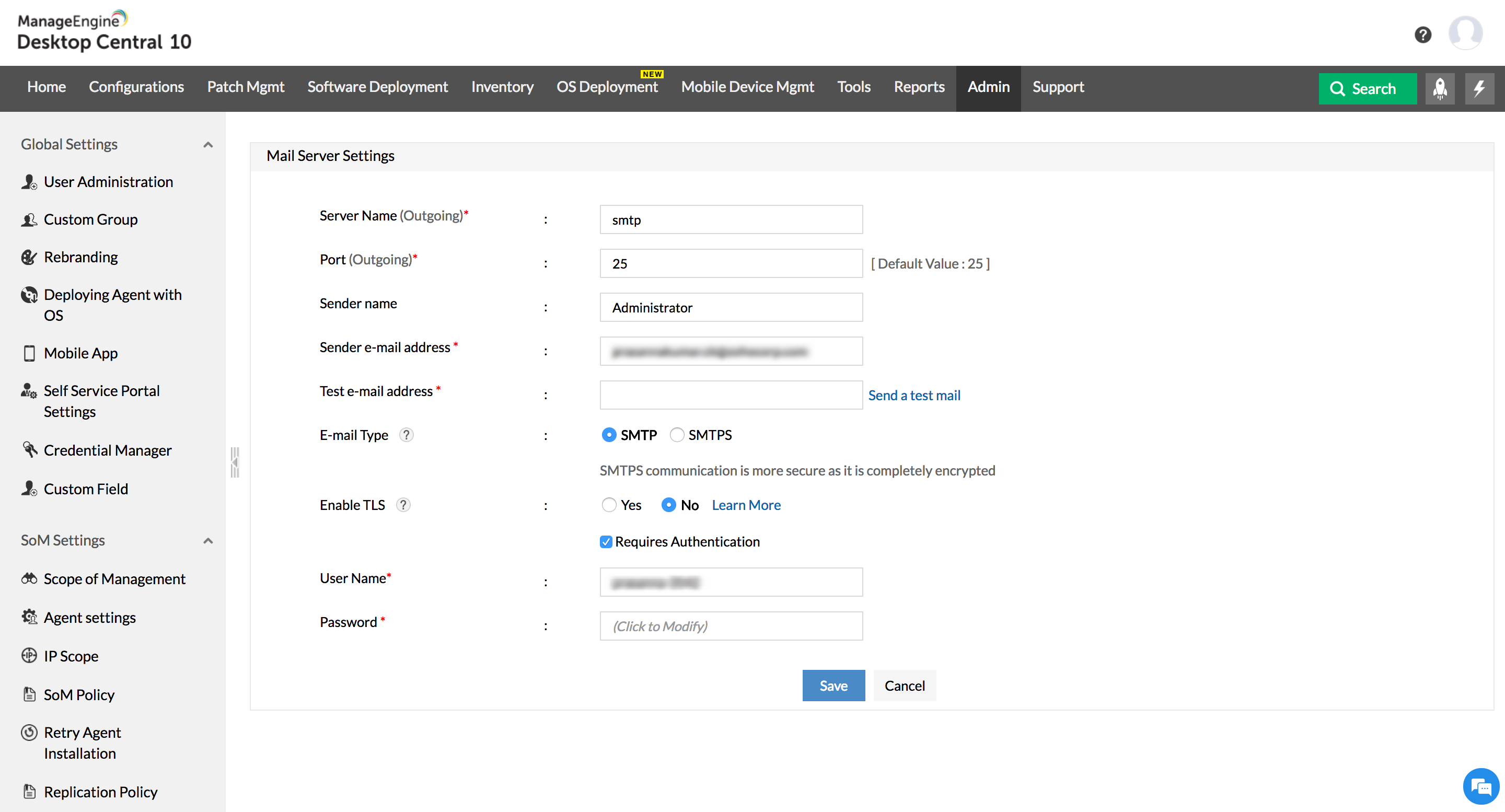 建议使用SMTPS通信,确保邮件服务器通信安全。配置路径:管理 -> 邮件服务器设置。