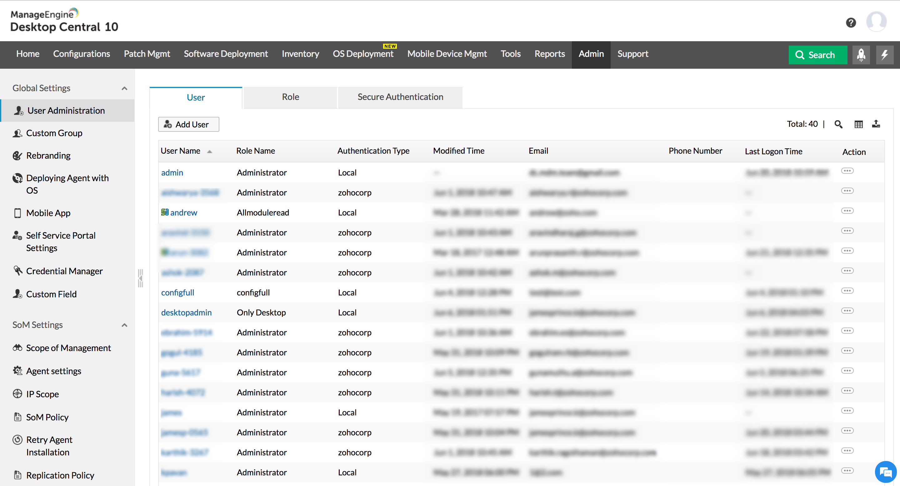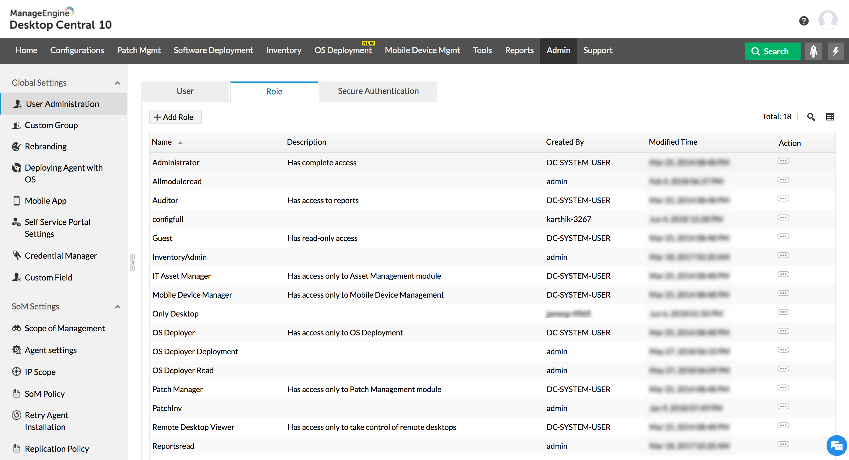 为技术员定义特定的角色和权限范围,避免意外数据泄漏的风险。您可以为Endpoint Central用户创建不同角色,授权特定模块权限,以及定义权限范围。打开控制台,点击管理 -> 用户管理 -> 角色