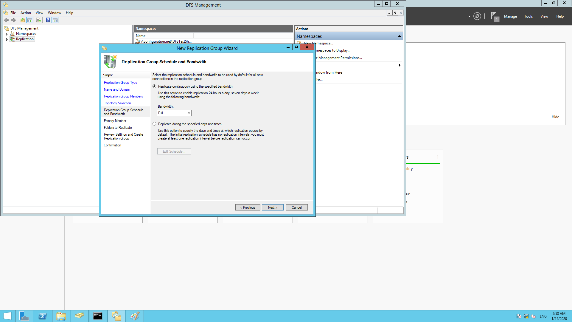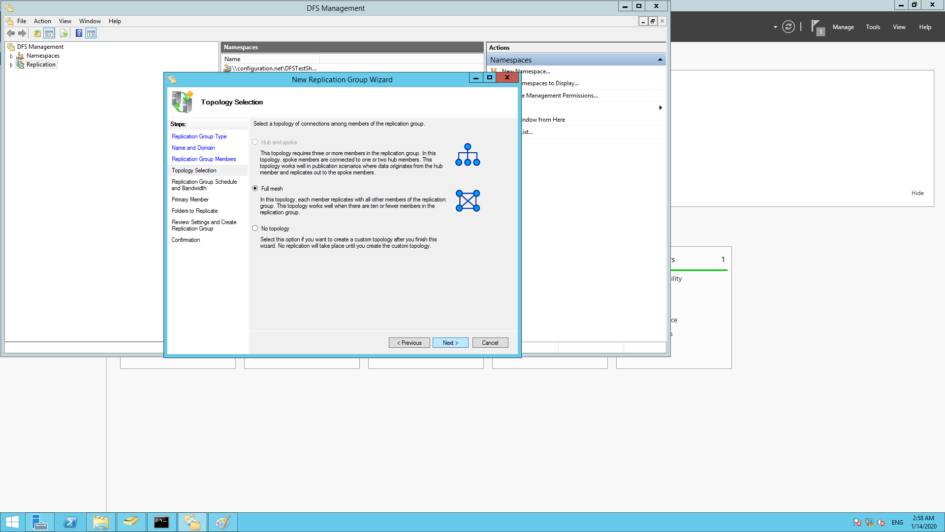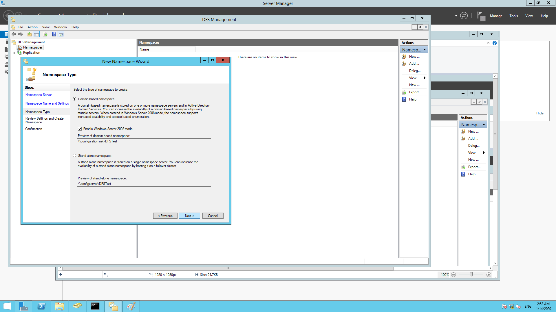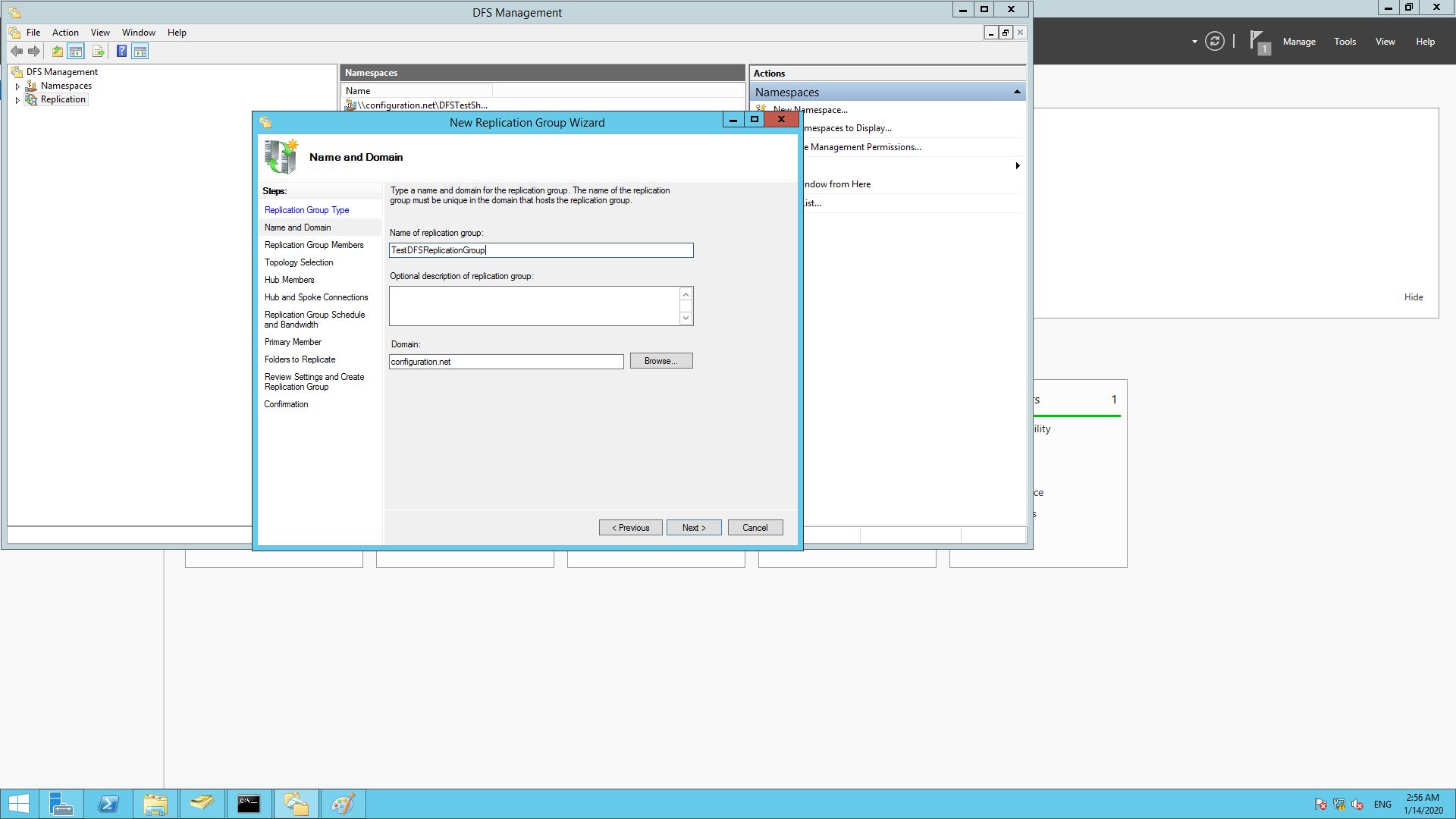 在Windows服务器上设置DFS的下一步是设置命名空间。命名空间用于调用正在复制的共享文件区域。要设置命名空间: