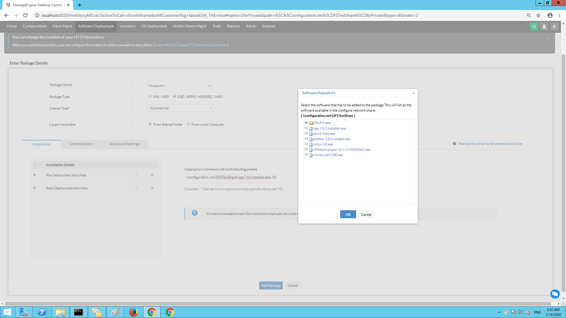 现在,您已选择DFS共享作为您的网络共享存储库。当您创建软件包时,可以选择“DFS共享”文件夹中的软件包,如下所示。