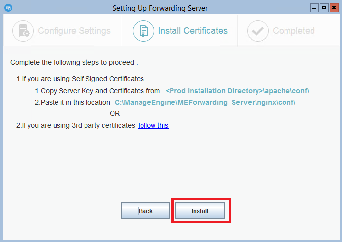 "copy server.crt (installed-location)\ManageEngine\MEForwarding_Server\nginx\conf"