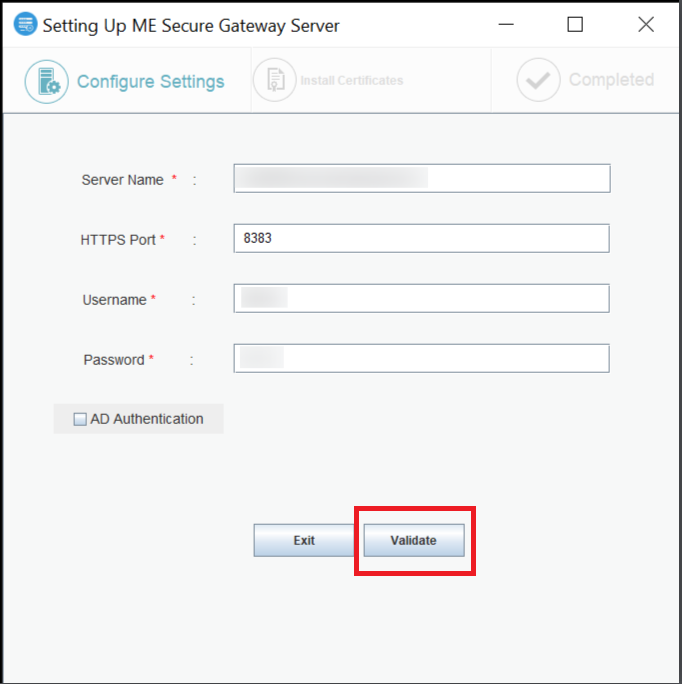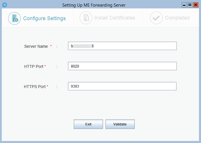 - 在“设置转发服务器”弹窗中,输入Desktop Central服务器名称和端口详细信息,如下所示,然后点击“验证”: