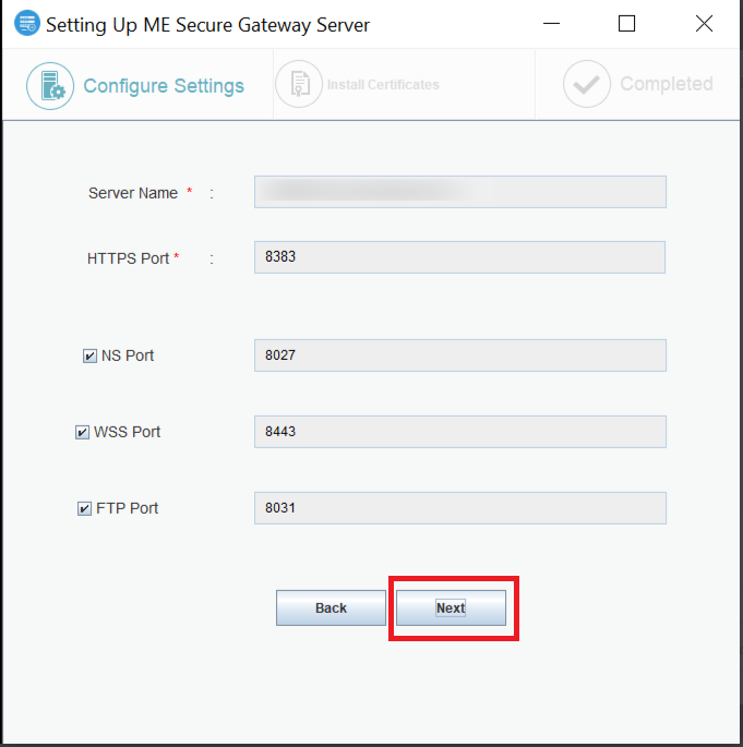 注意:如果弹窗未出现,使用终端导航至C:\ManageEngine\MEForwarding_Server\bin\并运行“FSConfigure.bat”。