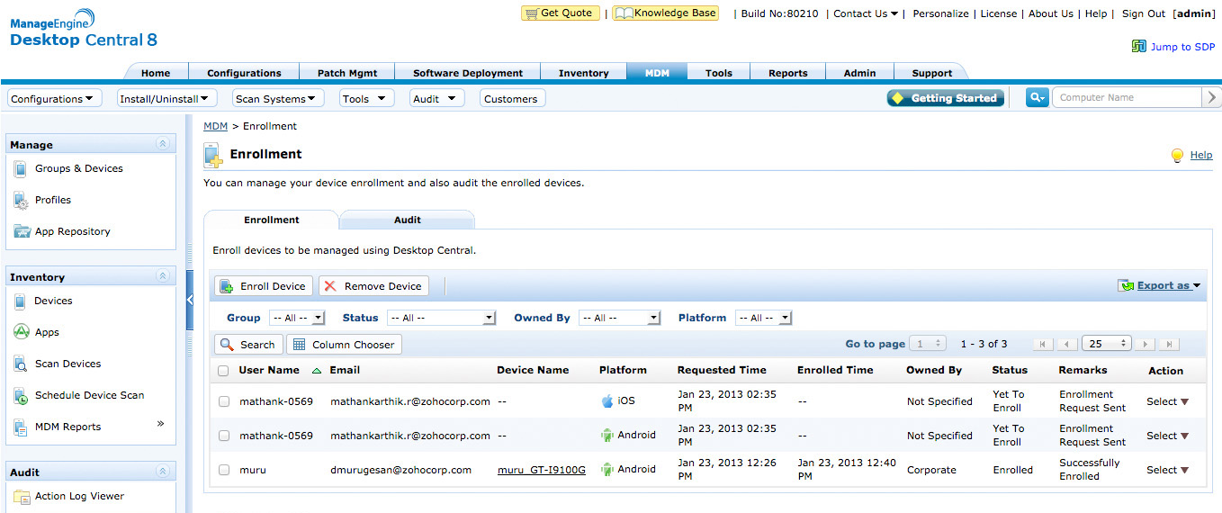 Endpoint Central 移动设备管理使系统管理员能够管理所有运行 V2.2 及更高版本的 Android 设备。从此,管理智能手机和平板电脑不再是一项艰巨的任务。Endpoint Central 使管理员能够监控、管理审计 Android 设备中的公司数据,并确保数据安全。同时还为 Samsung SAFE 设备和 Samsung KNOX 设备提供了一些高级控制和管理功能。