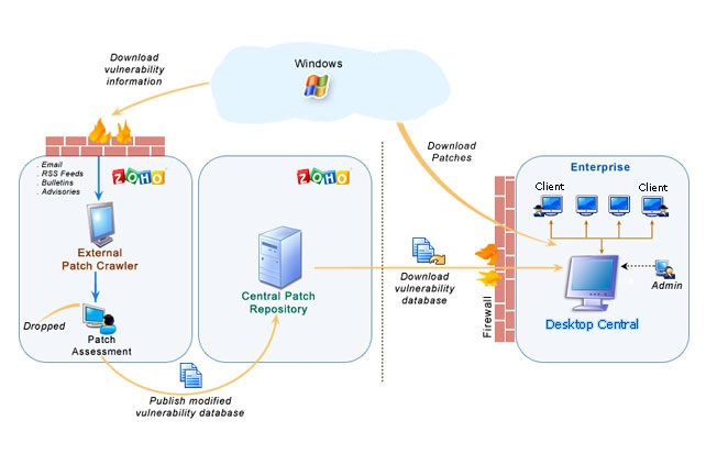 Zohocorp不断在互联网上搜索新发布的补丁和漏洞。一旦发现一个新补丁,经过充分的验证和测试,它将被添加到Zohocorp的中央补丁库中。这个存储库可以通过安装在客户机环境中的Desktop Central服务器访问,并用于评估网络中的漏洞。