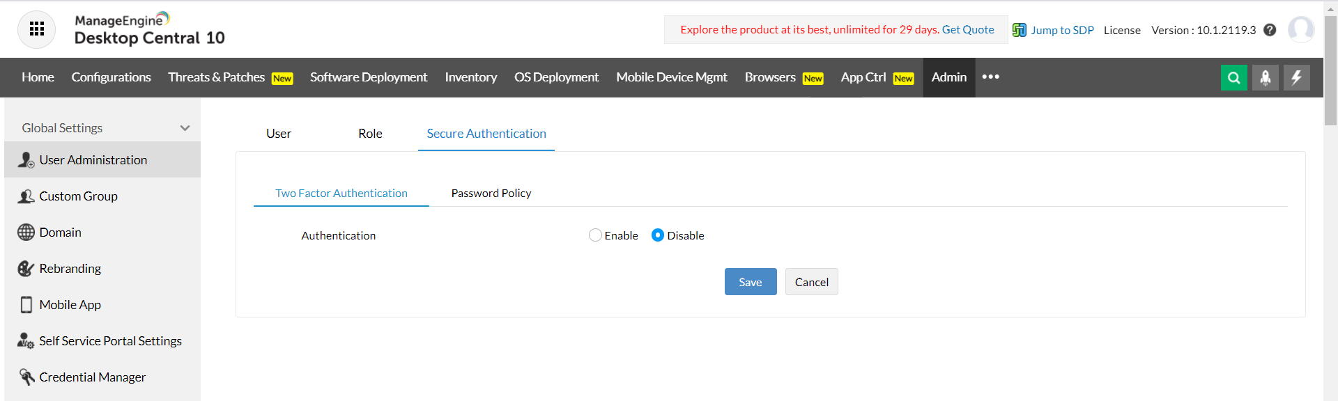 启用双因素身份验证后,所有用户登录Endpoint Central都需要提供额外的安全密码。启用TFA的步骤如下: