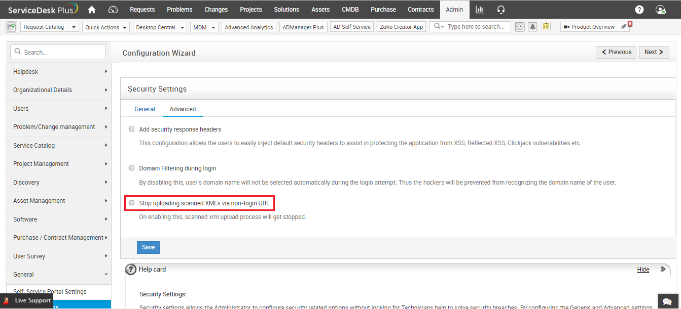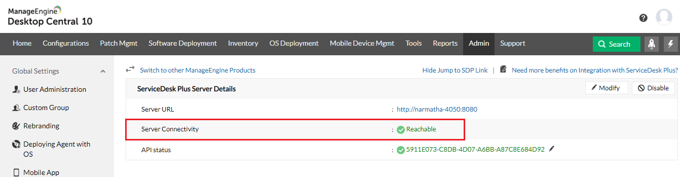 检查连接,点击管理>>集成>>ServiceDesk Plus设置,如下所示。如果服务器不可达,资产数据将不会同步到SDP。刷新所有网络连接,确保没有任何连接问题。