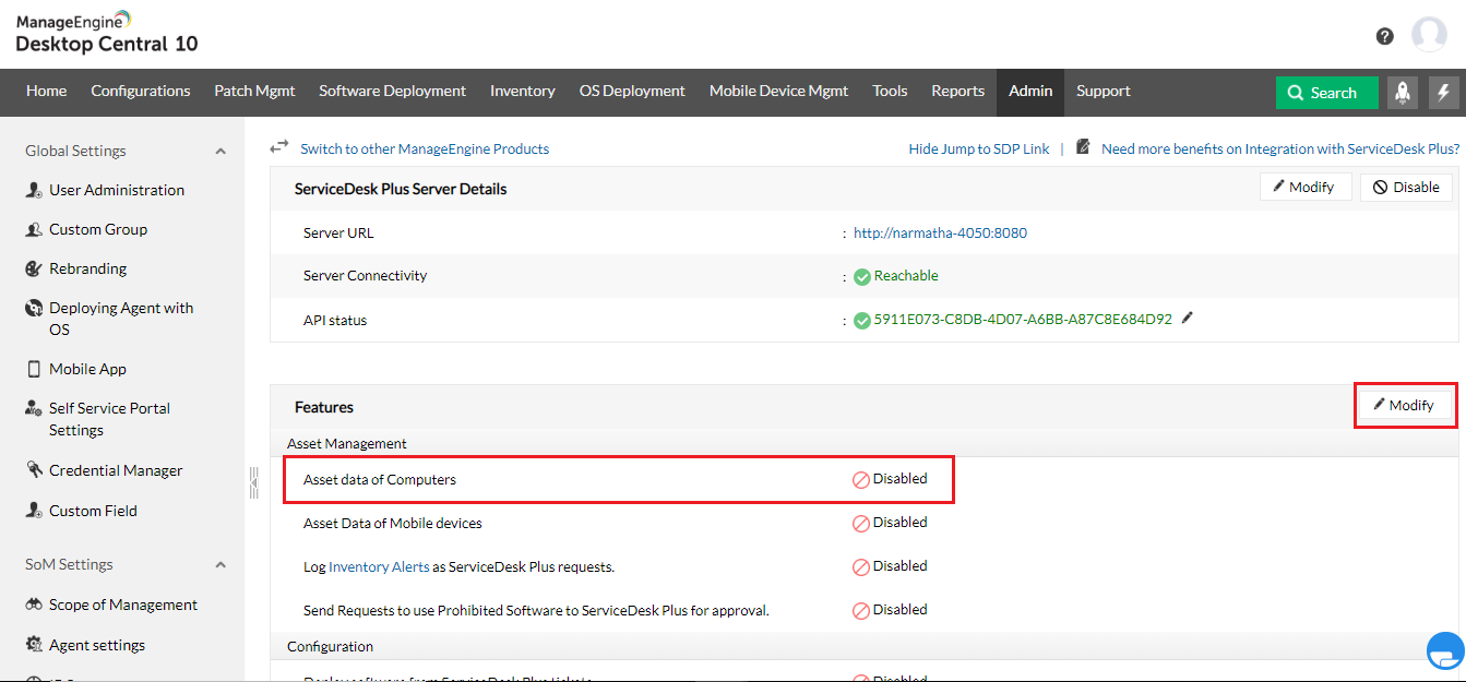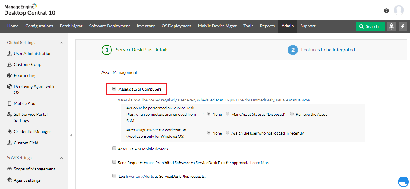 点击管理>>集成>>ServiceDesk Plus设置>>功能,确保启用了“计算机资产数据”。