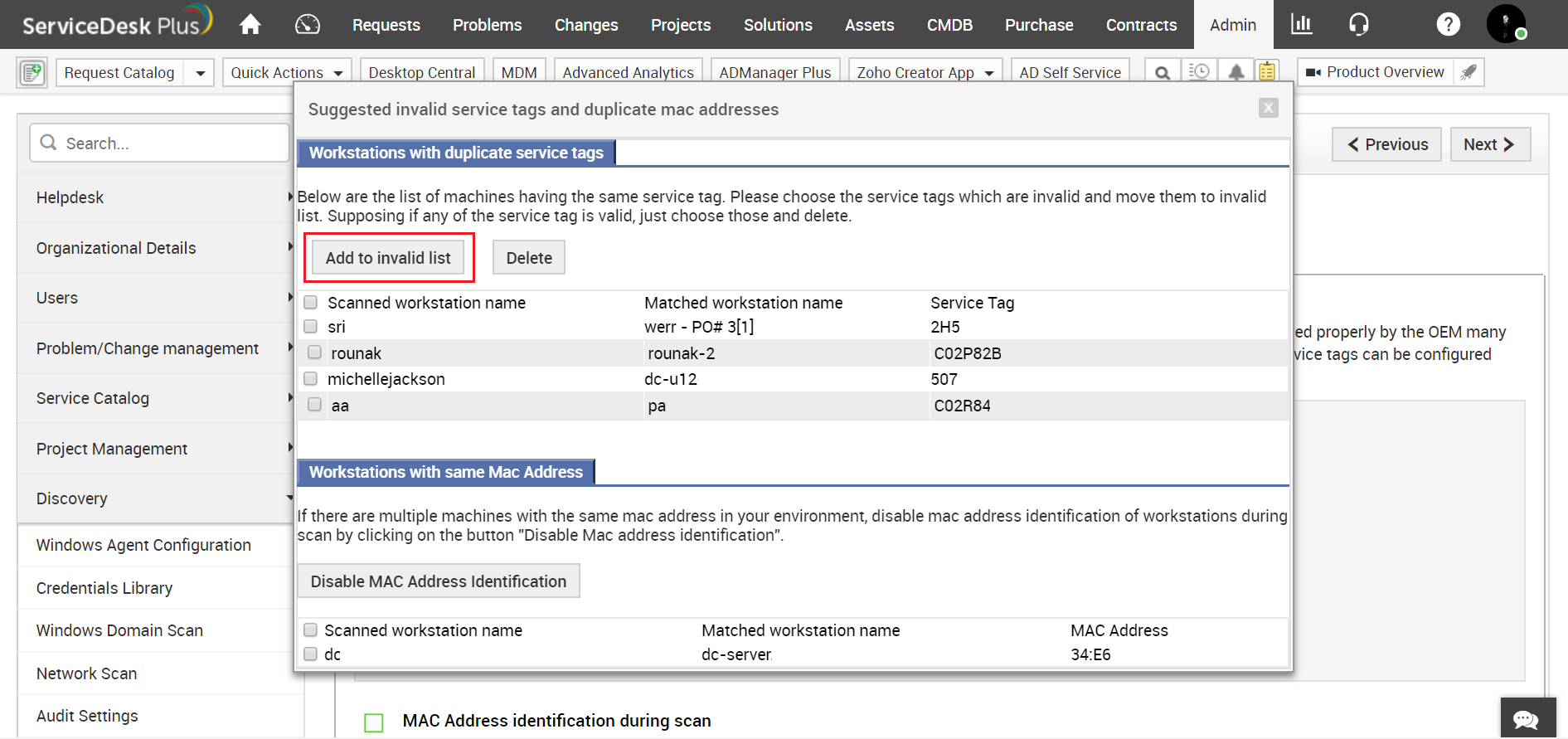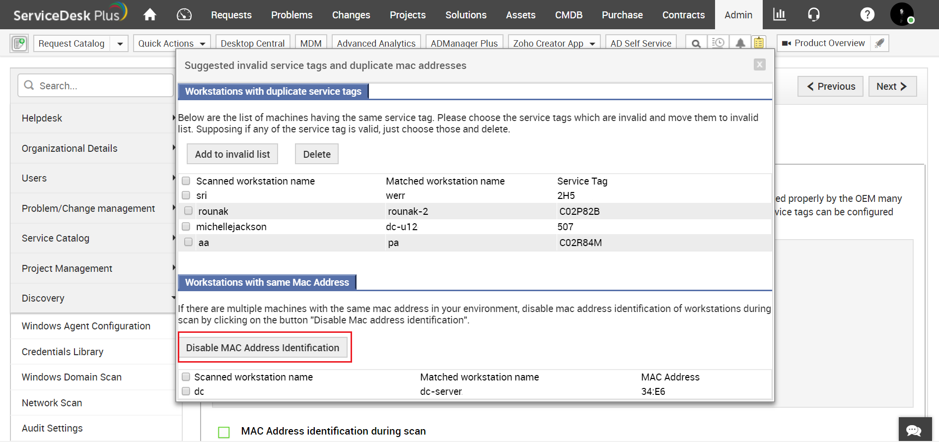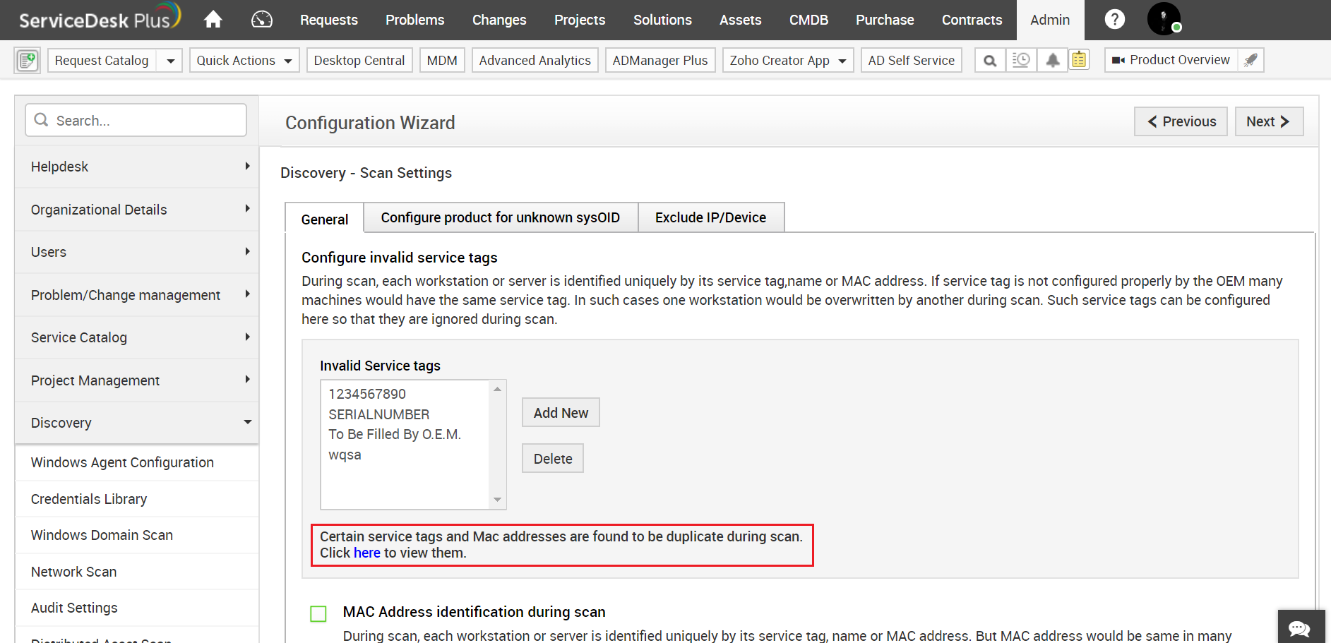 当Endpoint Central进行资产扫描时,每个工作站或服务器都会通过其服务标签、名称或MAC地址唯一标识。不同的机器可能具有相同的服务标签或MAC地址,在这种情况下,一台机器的资产数据将被另一台机器的数据覆盖。您可以检查机器中是否存在这种情况,在ServiceDesk Plus控制台中,进入管理>>发现>>扫描设置>>常规,如下所示: