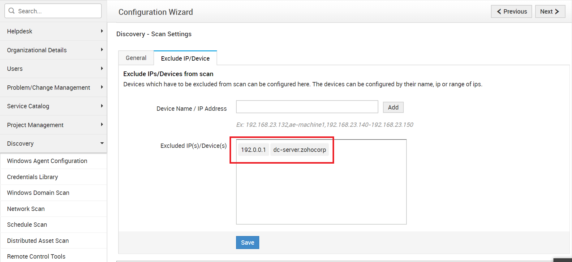 通过配置,可以将设备根据设备名称、IP地址或IP范围排除在资产扫描之外。ServiceDesk Plus控制台中不会同步这些排除设备的资产数据。如需移除或修改更改,请登录到SDP控制台。
