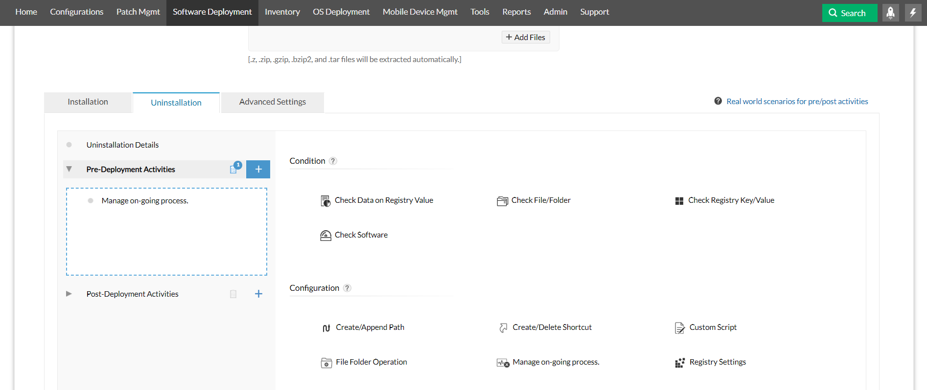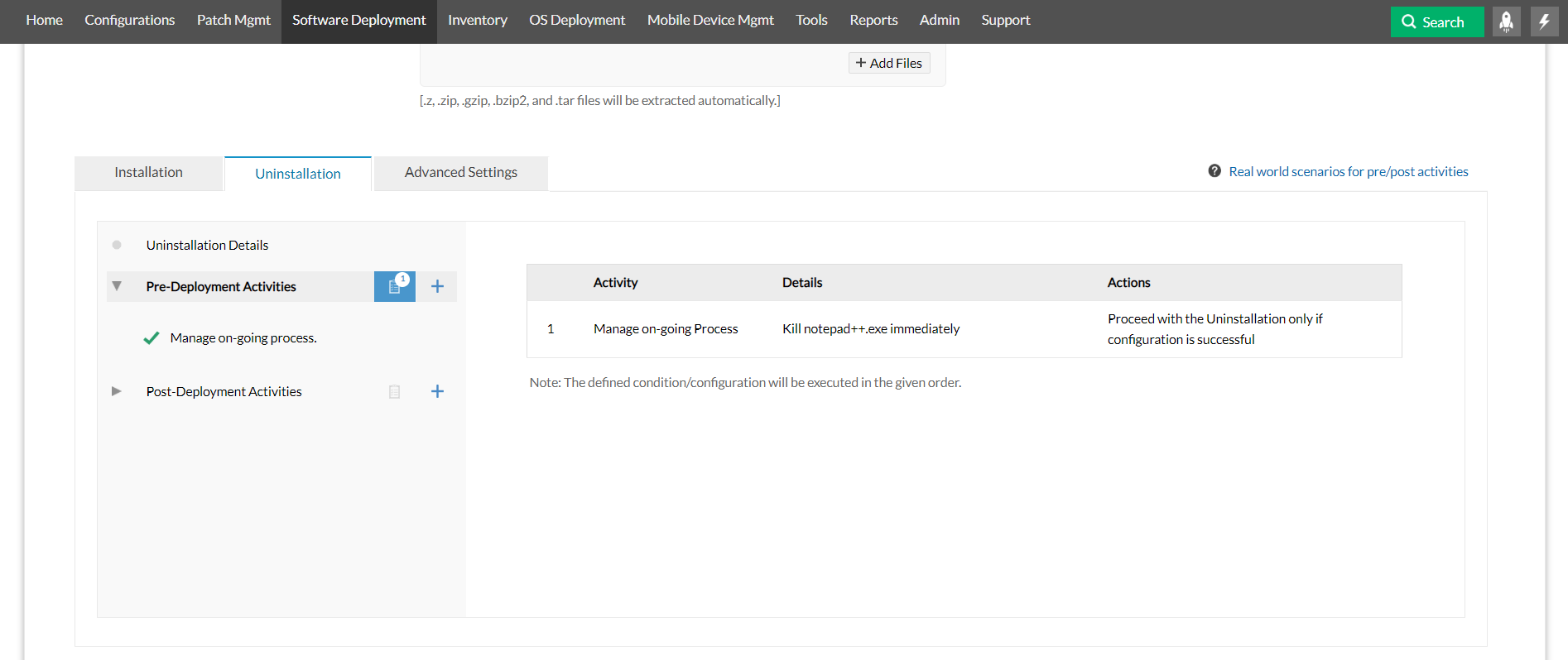 - John needs to make sure that the Notepad++ isn't running at the time the uninstallation is attempted. Hence, he selects the pre deployment configuration "Manage on-going processes" as shown below: