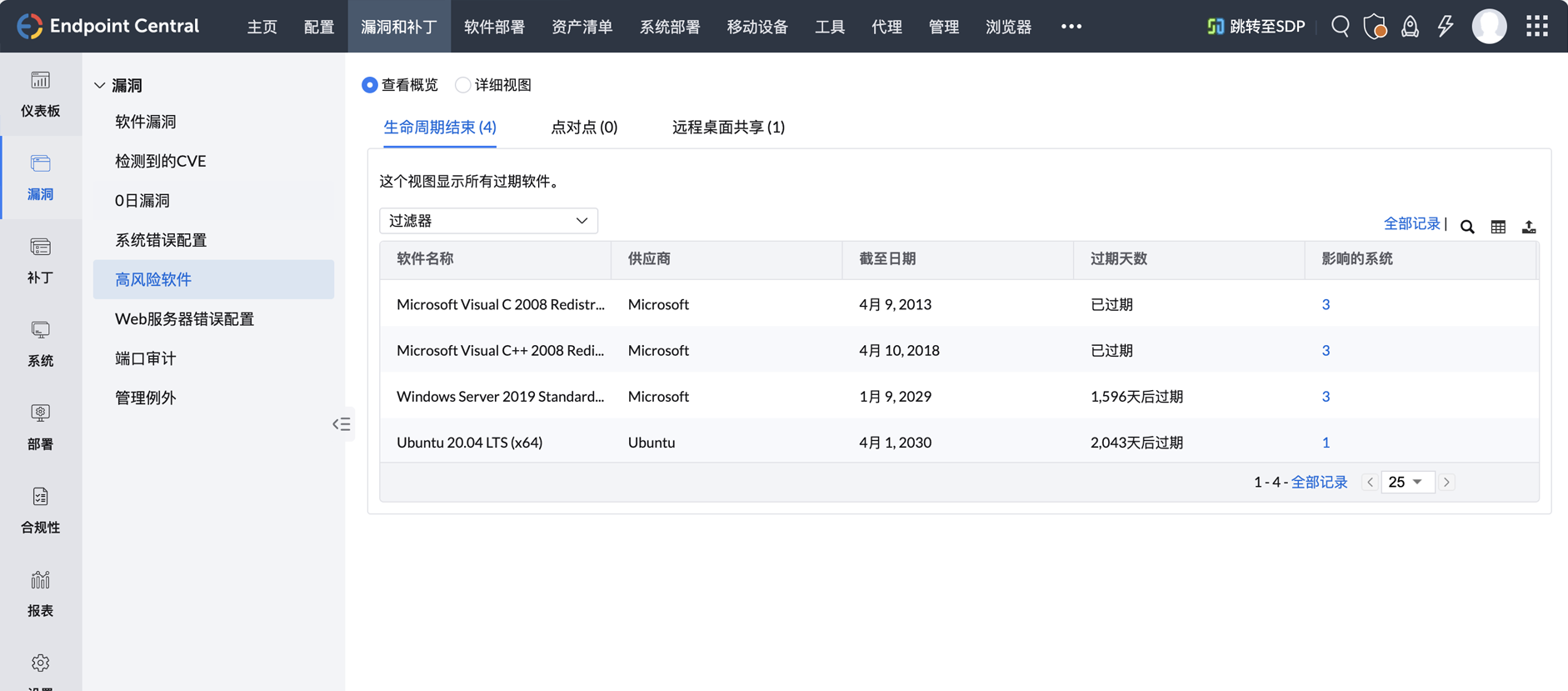 利用Endpoint Central的实时风险监视和检测能力,在软件和网络基础设施中识别零日漏洞。统一控制台还可以通过及时部署补丁和配置来简化零日漏洞的缓解,可以更快应用解决方法。