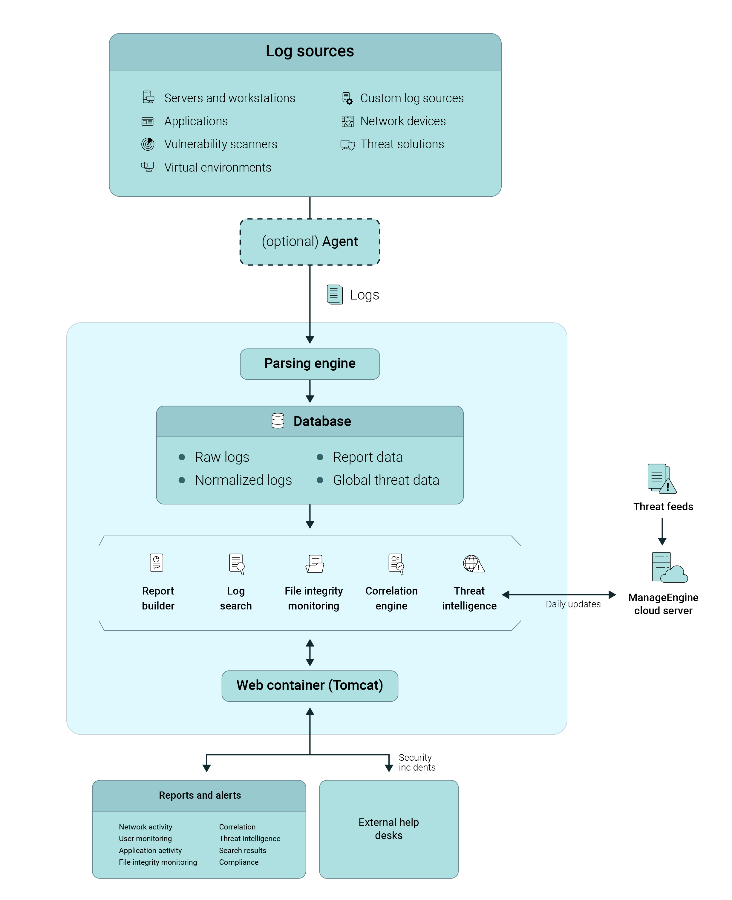 EventLog Analyzer 拥有无代理架构,它使用内置的系统日志和事件日志服务器存储,从所有配置的设备中获得的事件日志和系统日志,提供全面的事件、合规和自定义报表。这有助于网络管理员分析系统问题,提高网络安全性,并减少服务器、工作站、域控制器、交换机和企业网络路由器的停机时间,解析收集的日志并生成报表。