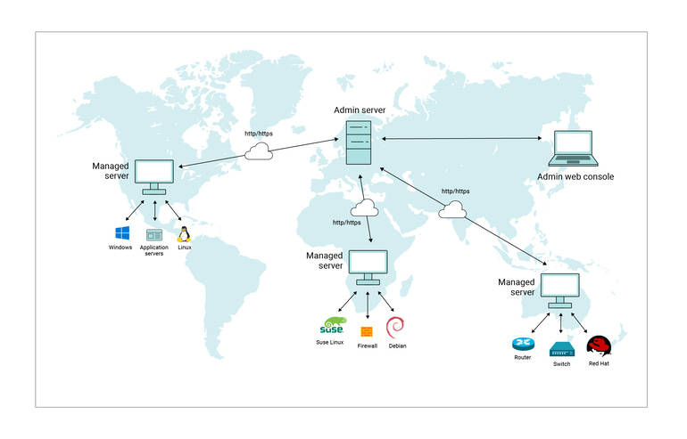 EventLog Analyzer - 分布式版 采用分布式部署方式。这个架构由一个管理服务器和N个被管服务器组成。被管服务器安装在不同的地理位置(每个局域网环境一个),并连接到管理服务器。这让网络管理员可以在中心地点远程查看不同主机/应用程序日志的详细信息。所有的报表、告警和其他主机/应用程序信息都可以通过一个控制台访问。这种架构有益于拥有全球范围的不同分支机构的大型企业管理者进行管理。这对安全服务提供商(MSSP)来说是一个利好。他们可以在一个地点监控客户不同位置安装的被管服务器。