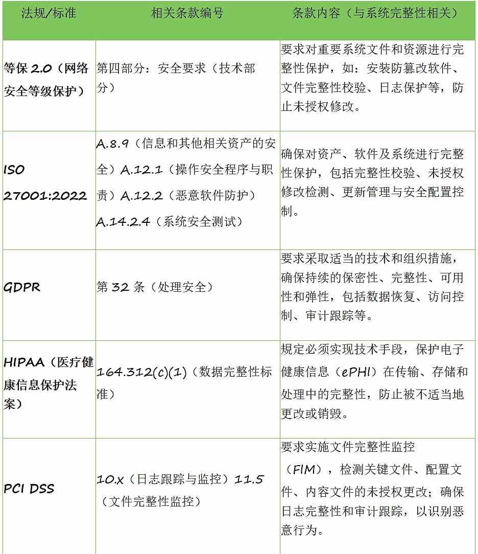 系统完整性对保证用户信息安全和企业业务平稳运行起到非常关键的作用,众多的法规对“系统完整性”提出了明确规定,以下条款更加清晰的列举了等保2.0、GDPR、ISO 27001等法规中的具体要求。