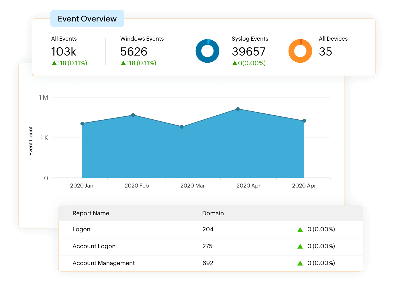 - 事件概述仪表板提供了有关顶级Windows、Linux和Syslog安全事件、关键应用程序事件以及文件和文件夹修改事件的详细信息。