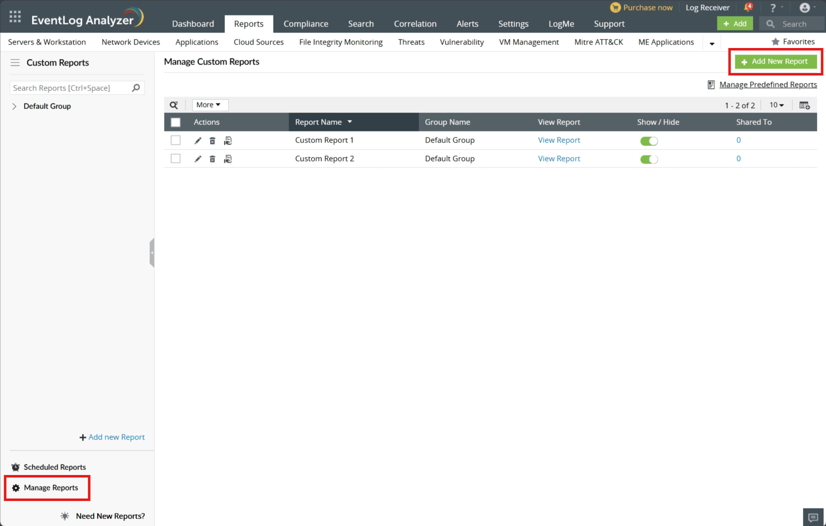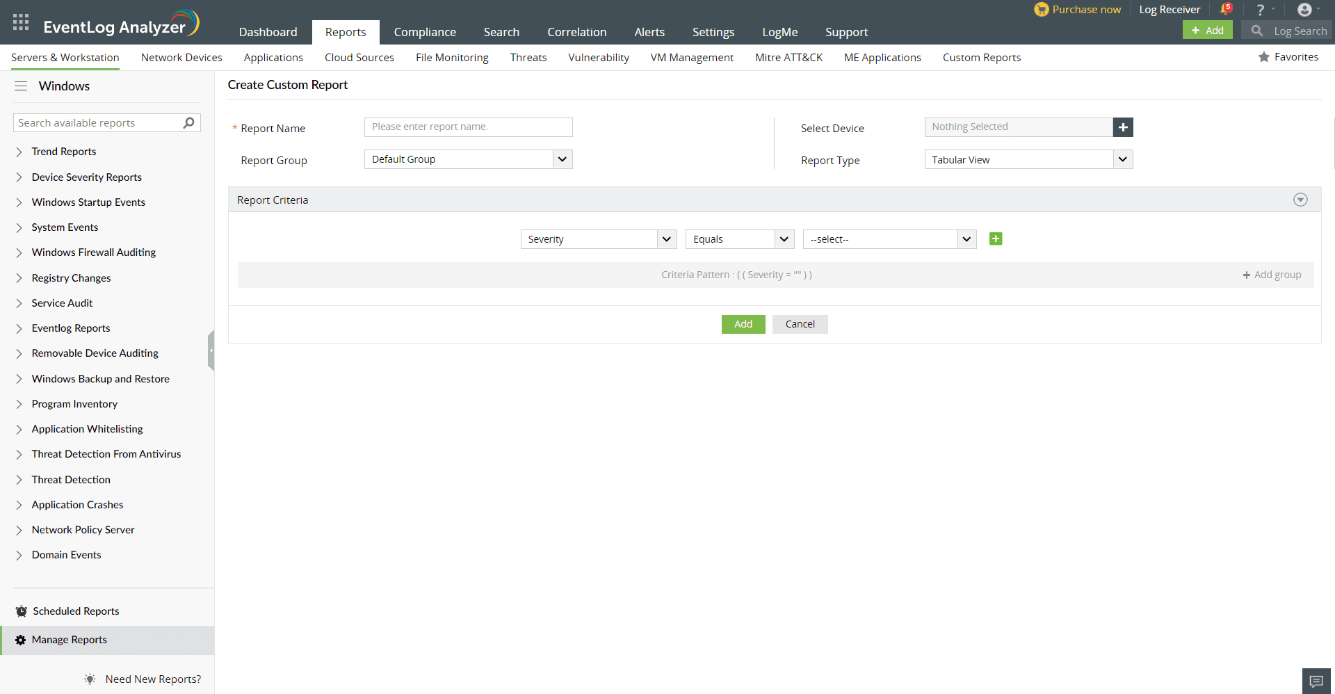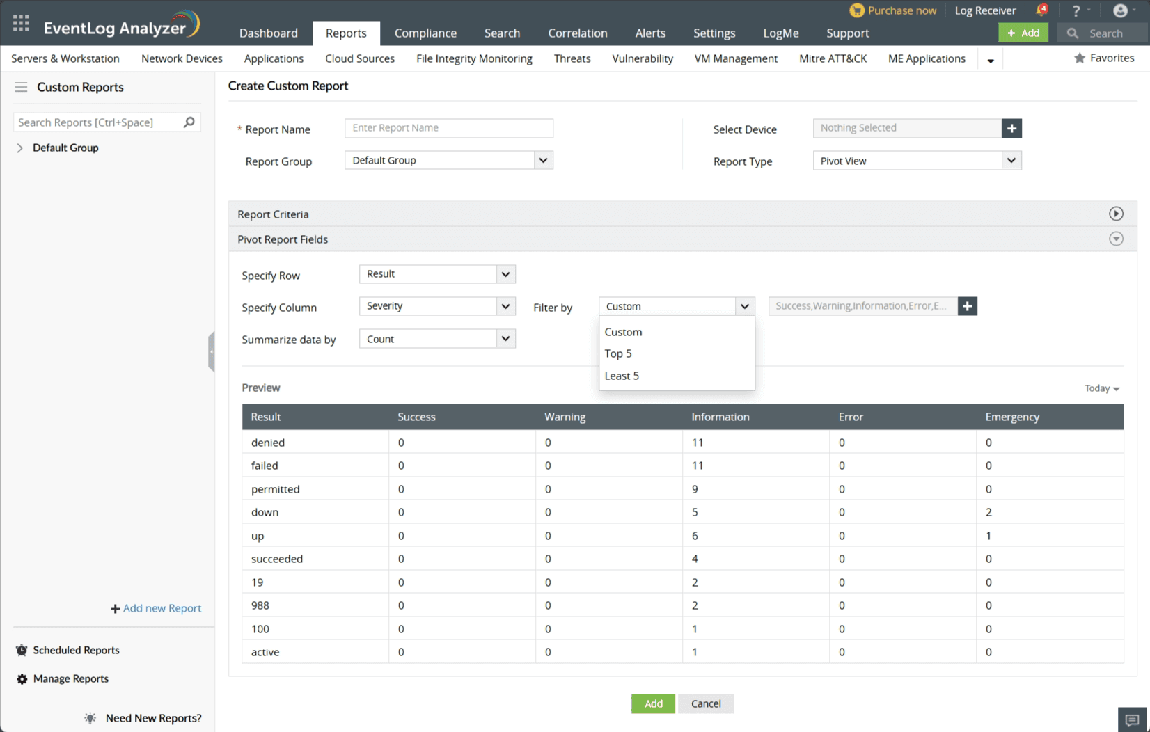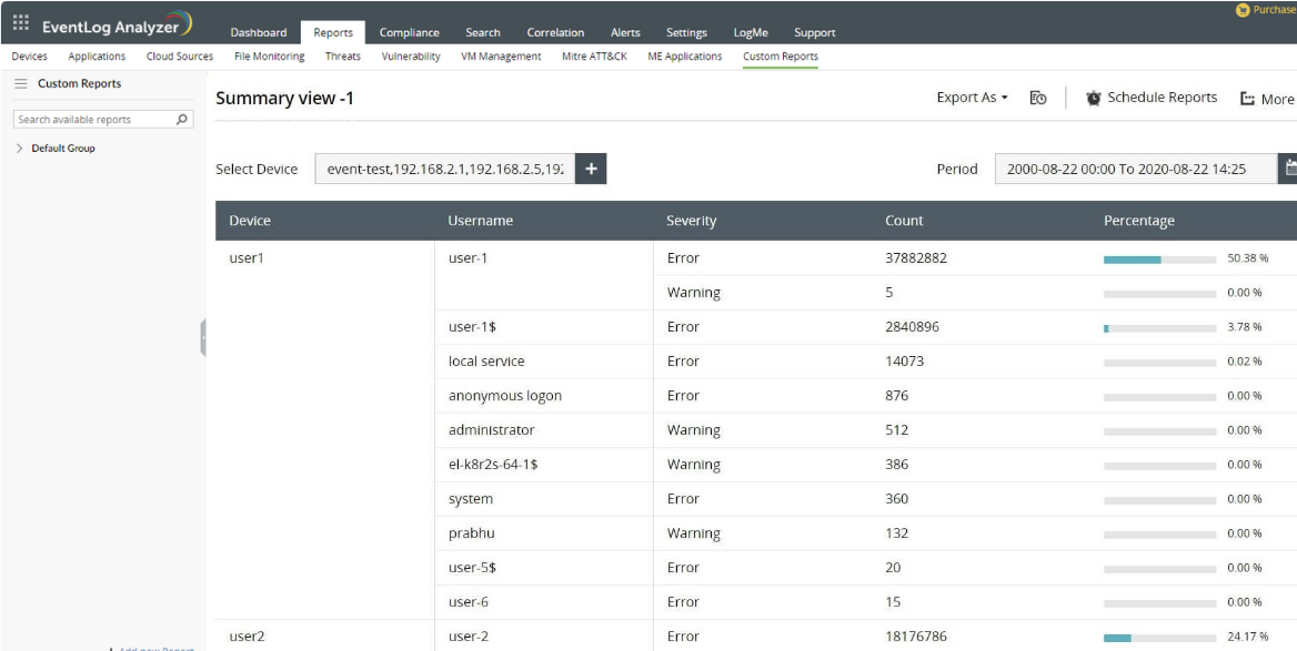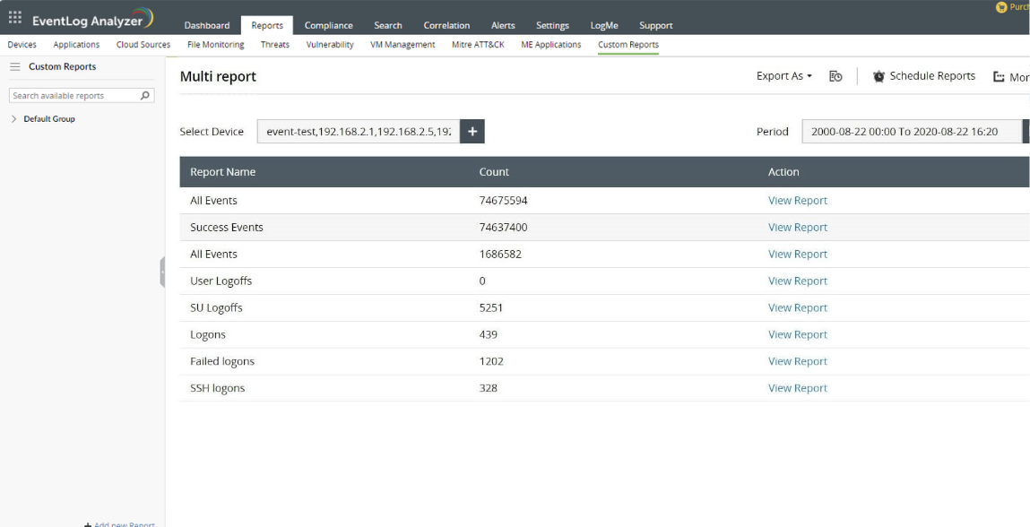 点击此处展开EventLog Analyzer 可以根据您设定的条件生成自定义报告。您可以使用字段值和逻辑运算符来指定这些条件。这些报告将列在 自定义报告 下。