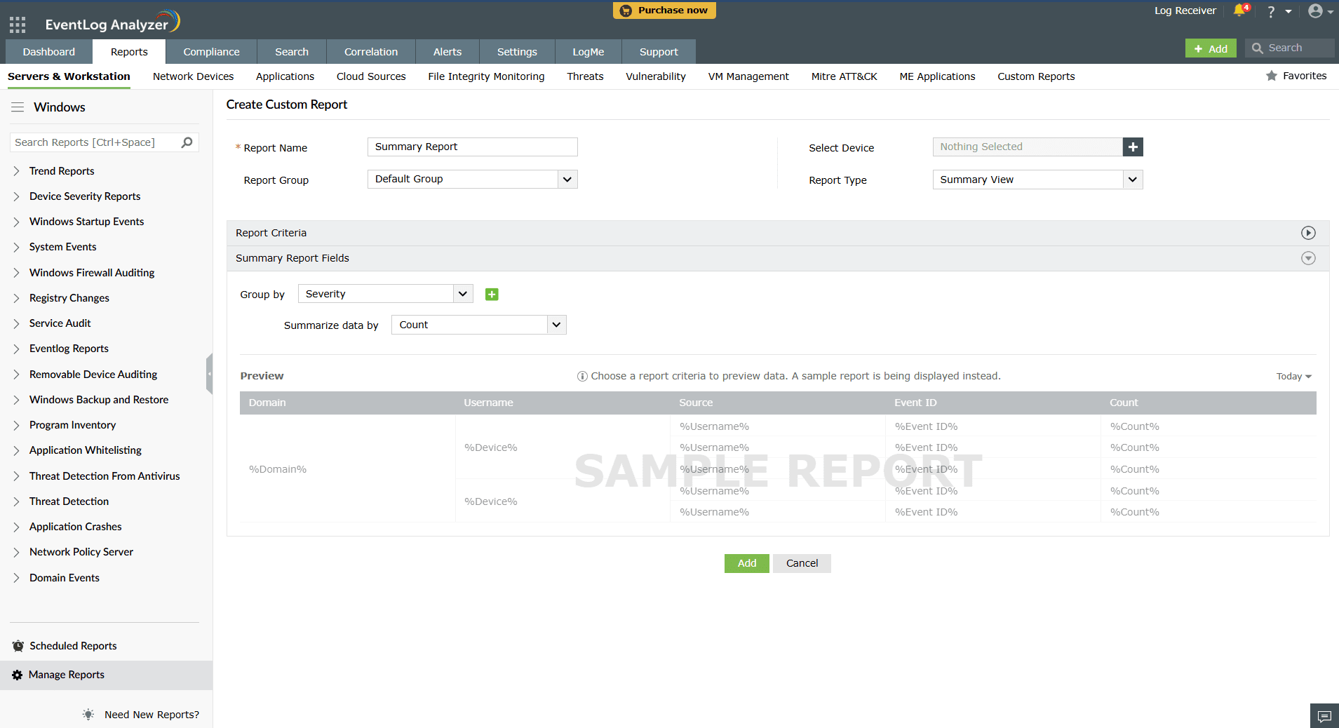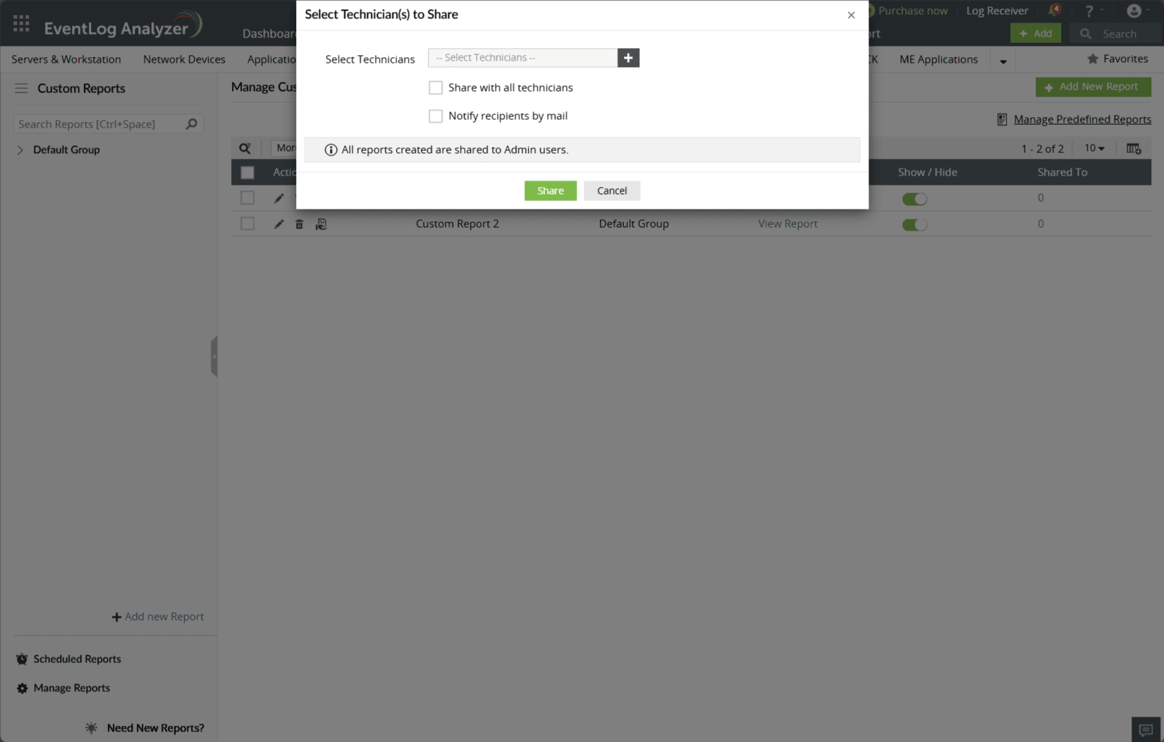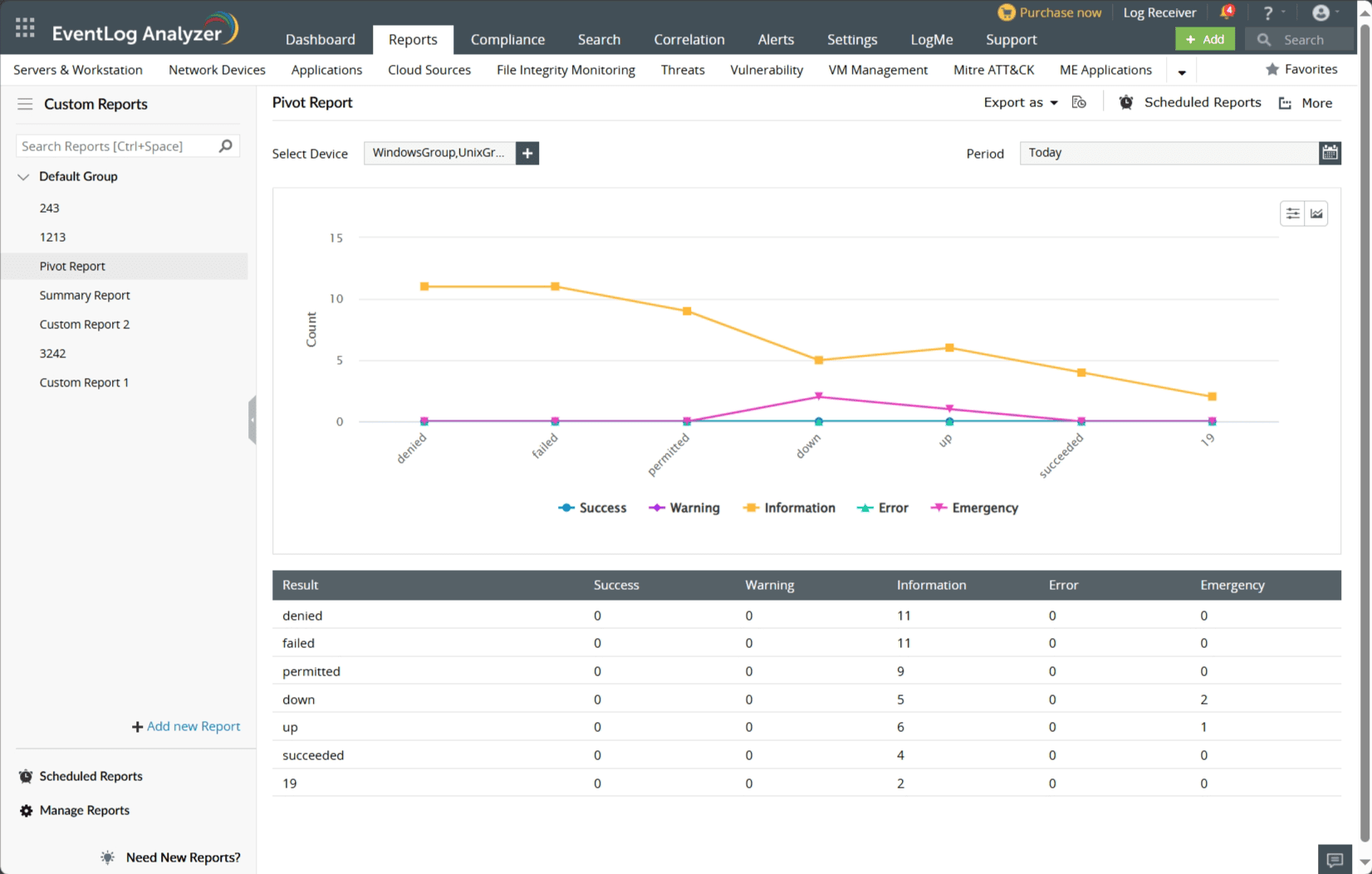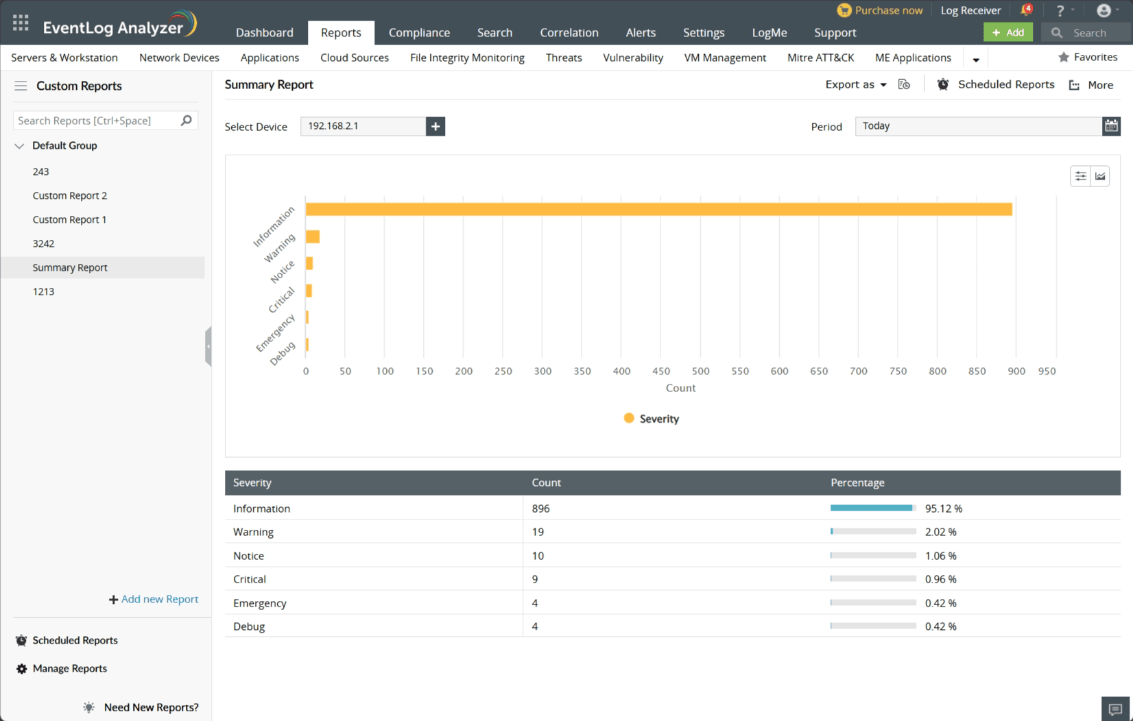 点击此处展开EventLog Analyzer 可以根据您设定的条件生成自定义报告。您可以使用字段值和逻辑运算符来指定这些条件。这些报告将列在 自定义报告 下。
