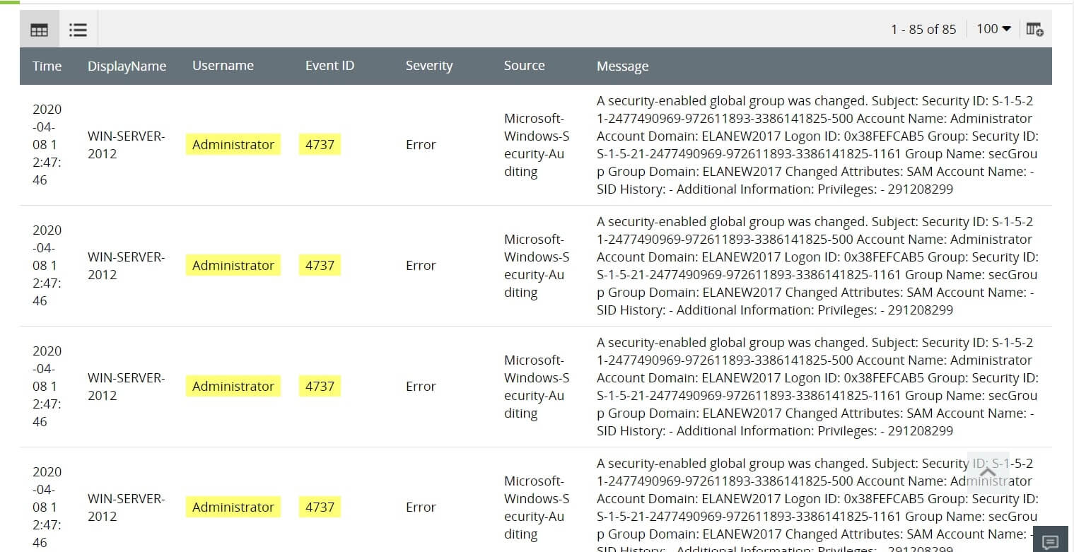 当您需要监控作为报告生成依据的字段中的特定值时,此视图非常有用。选择报告条件后,您可以选择要监控的字段以及该字段中的值。这些值会分别以独立的列显示,并显示其计数。