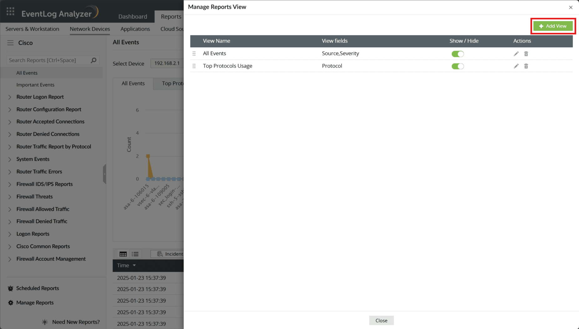 EventLog Analyzer 允许您为同一份报告创建多个视图。这使您能够根据不同的参数(如时间、域、来源等)查看报告。不同的视图将基于同一组日志数据生成。