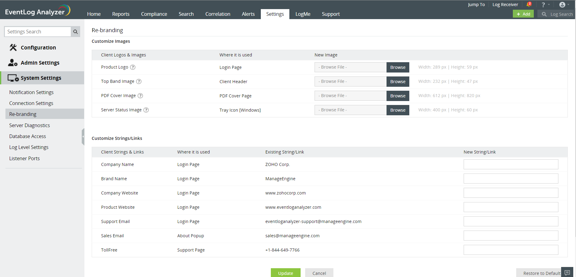 点击此处展开EventLog Analyzer 使您能够自定义产品中的徽标、图像和链接,以满足 MSSP(托管安全服务提供商)的需求。