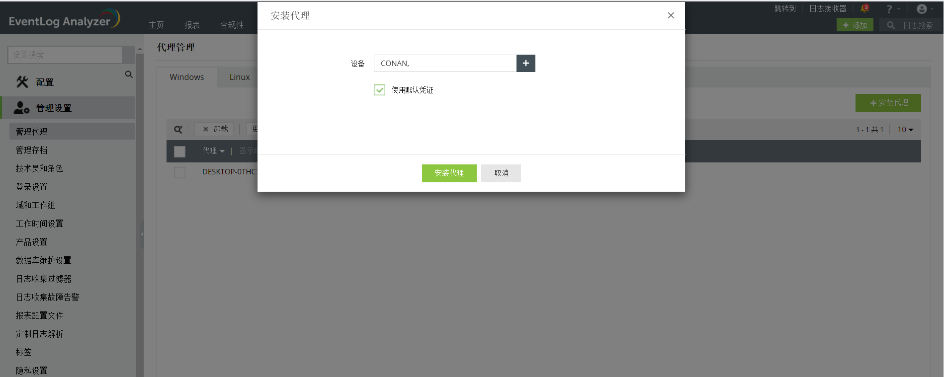 强制重新升级EventLog Analyzer代理要强制EventLog Analyzer进行升级, - 在设置Settings标签中,点击管理设置 > 管理代理。