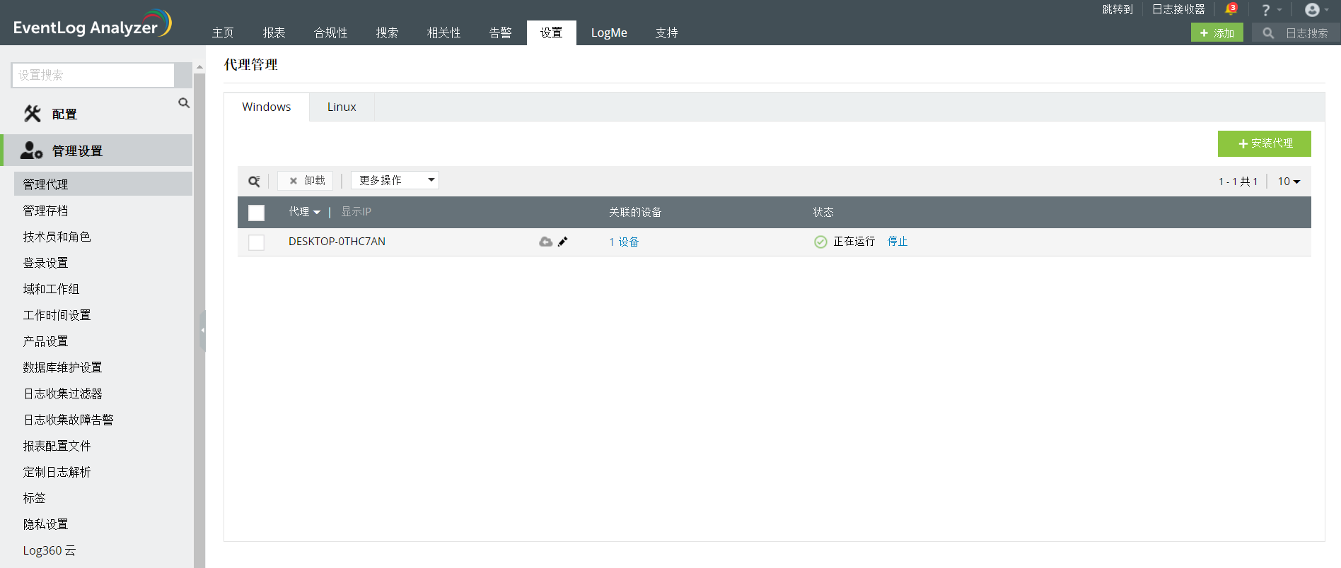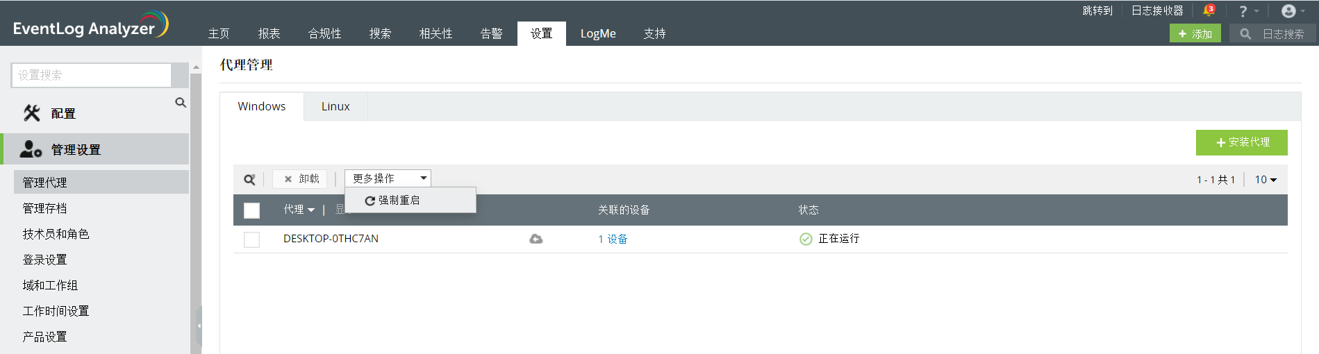 强制重新启动EventLog Analyzer代理要强制EventLog Analyzer重新启动, - 在设置Settings标签中,点击管理设置 > 管理代理。