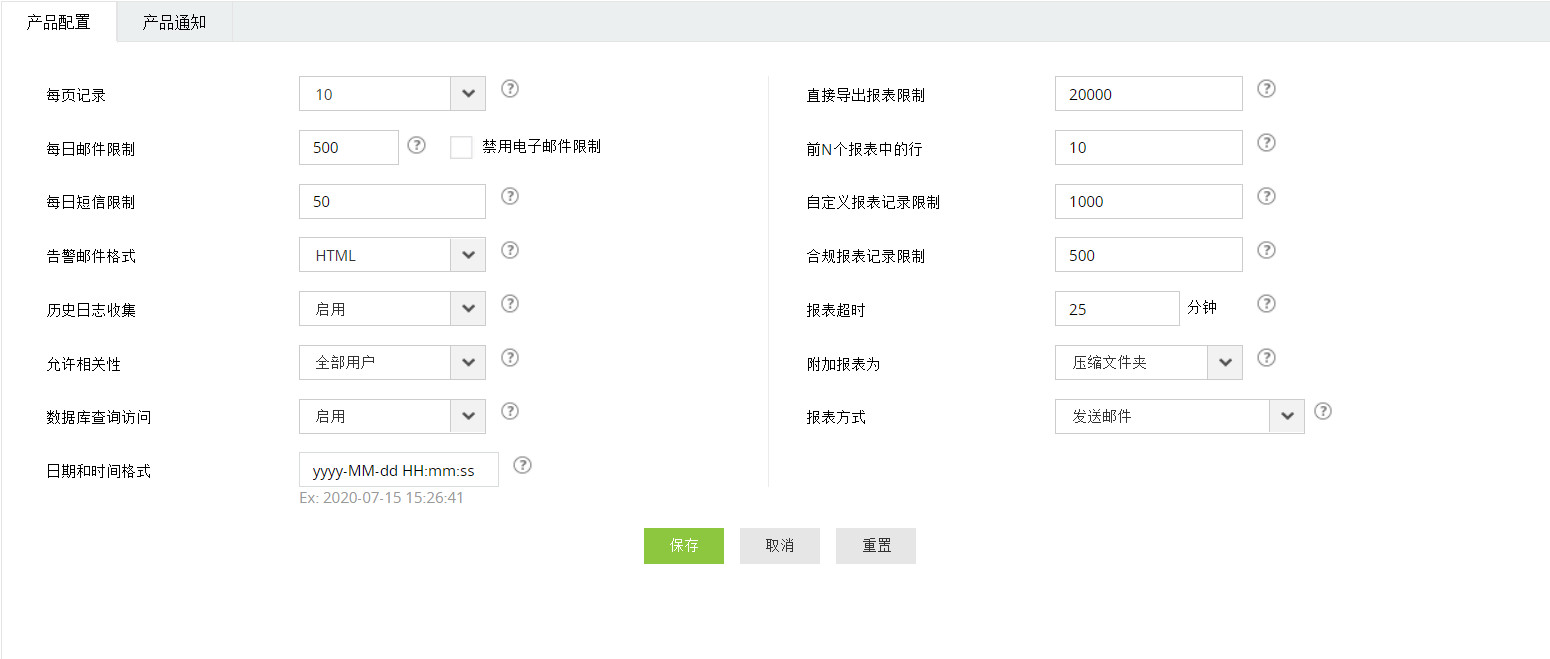10 | 日期和时间格式 | yyyy-MM-dd HH:mm:ss | 设置需要在整个产品中显示的日期和时间格式。除了几种可用的预定义格式外,您还可以创建自己的格式。创建您自己的日期和时间格式时需要遵循一些规则: - 允许的分隔符为连字符(-)、斜杠(/)、句号(.)、冒号(:)、逗号(,)和空格。