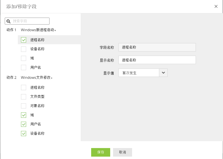 选择在报告中显示的字段,在每个操作下选择相应的复选框。 您还可以通过点击编辑图标设定每个字段的选项。 在需要的字段旁: - 显示名称:这是报表中显示字段的名称。如果您想在相同字段(如用户名)显示不止一个活动时,这非常有用。您可以通过修改显示名称区分相似的字段。例如, "登录失败用户名"和 "登录成功用户名"