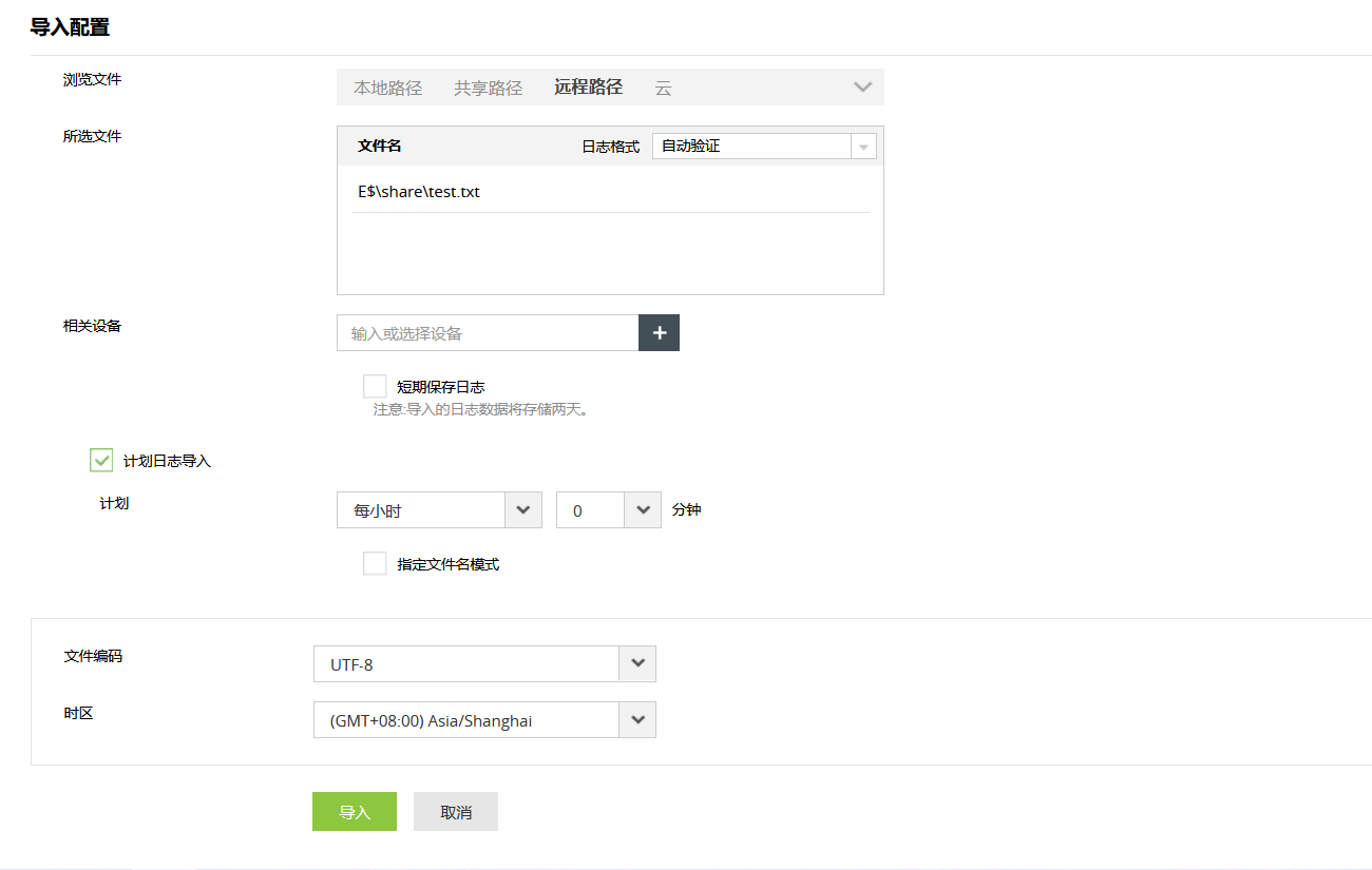- 如果要定期自动执行日志文件导入,请启用计划导入日志选项。