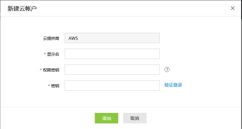 - 输入AWS账户的显示名称、权限密钥和密钥,点击添加。/li>