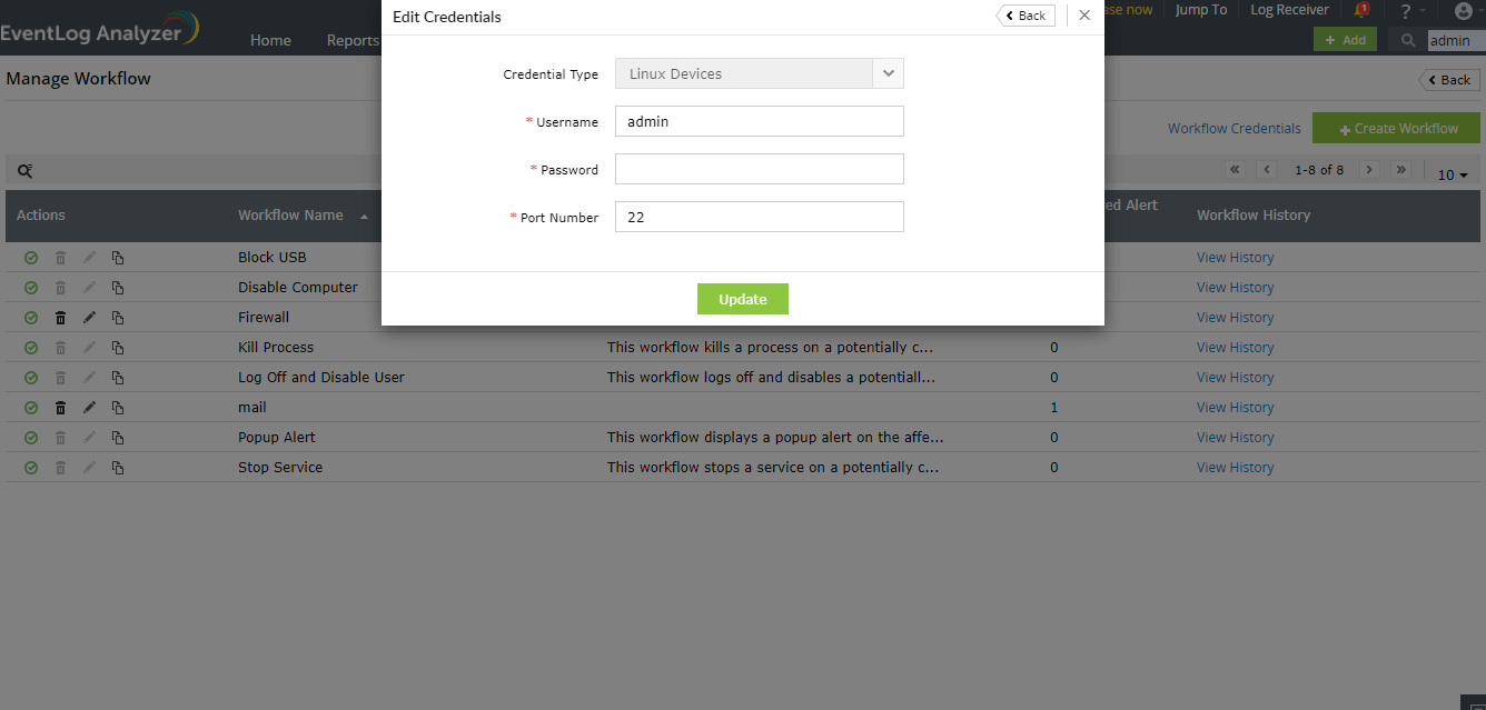 您可以在您拥有管理权限的Windows、Linux和思科设备上自动执行工作流。您必须在EventLog Analyzer中更新这些设备的凭据才能无缝执行工作流。