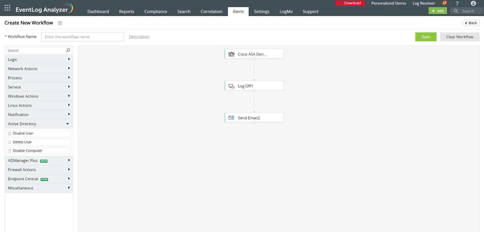 EventLog Analyzer 包含多个工作流块,可帮助您配置工作流以执行所需的操作。逻辑块分为不同的部分。