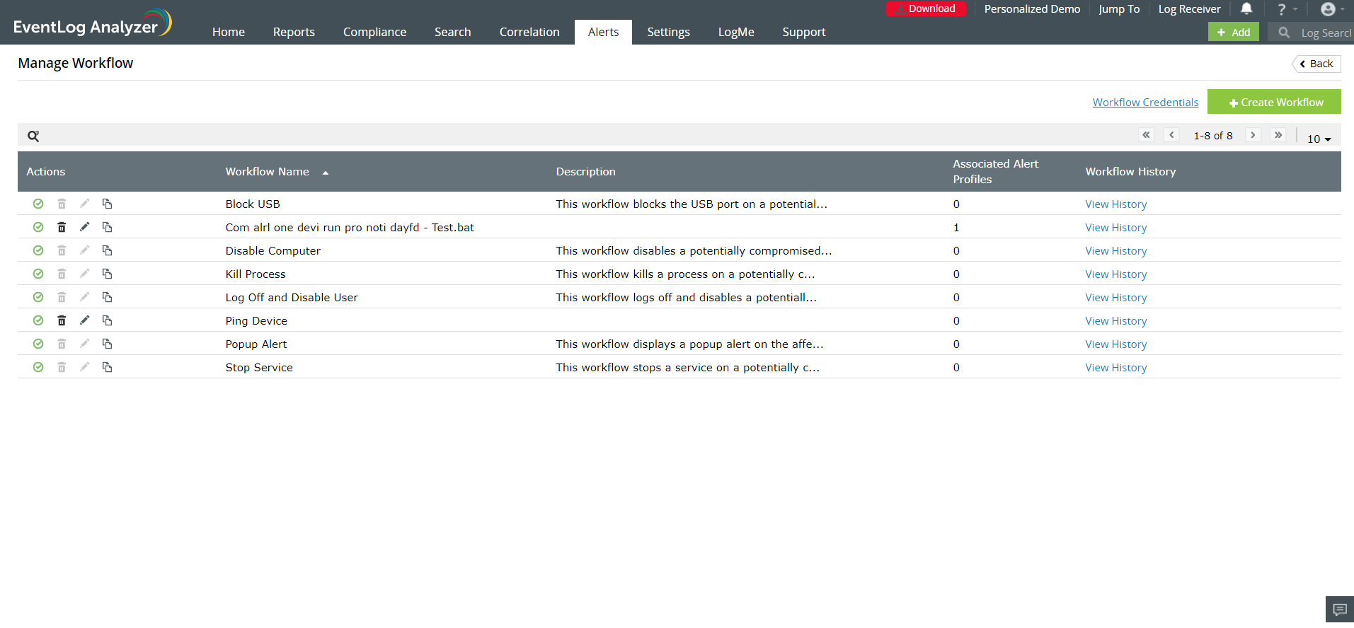 您可以通过进入告警标签并点击更多工具图标中的工作流来查看和编辑EventLog Analyzer 中的现有工作流。管理工作流页面显示工作流列表、它们的描述、与每个工作流关联的告警配置文件的数量以及它们的历史记录。您可以通过点击相应的图标来启用或禁用、删除、编辑和复制工作流。