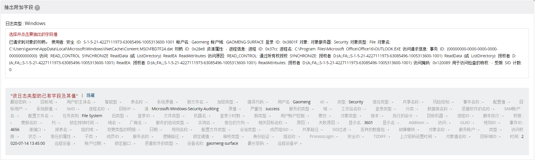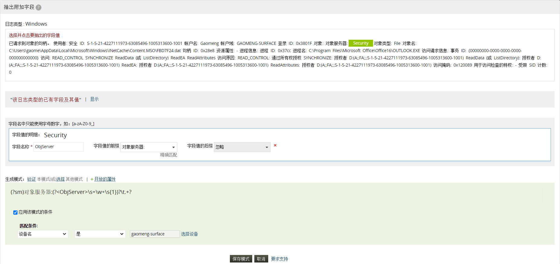 前缀Logon Type可以是静态值,因为大部分的日志都有Logon Type字样。而对于Source Network Address可以是动态的,因为日志中可能使用不同的描述,如Source IP Address、Source Address,而这些描述都可以使用一个正则表达式模式。 当然,如果前后缀都使用准确匹配,那么字段提取就会更加精准。 第3步:验证模式并保存为新的字段