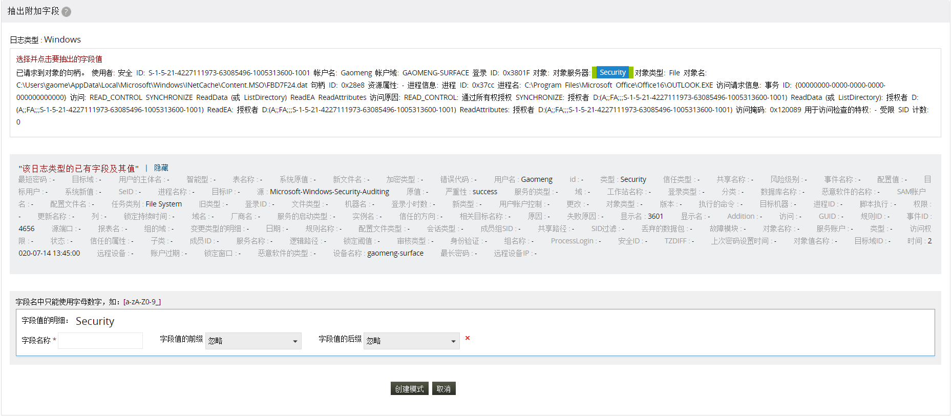在消息中选择并点击要提取的值。 提供该值的字段名。指定字段值的前后缀。 点击创建模式来生成分析规则和正则表达式的模式。