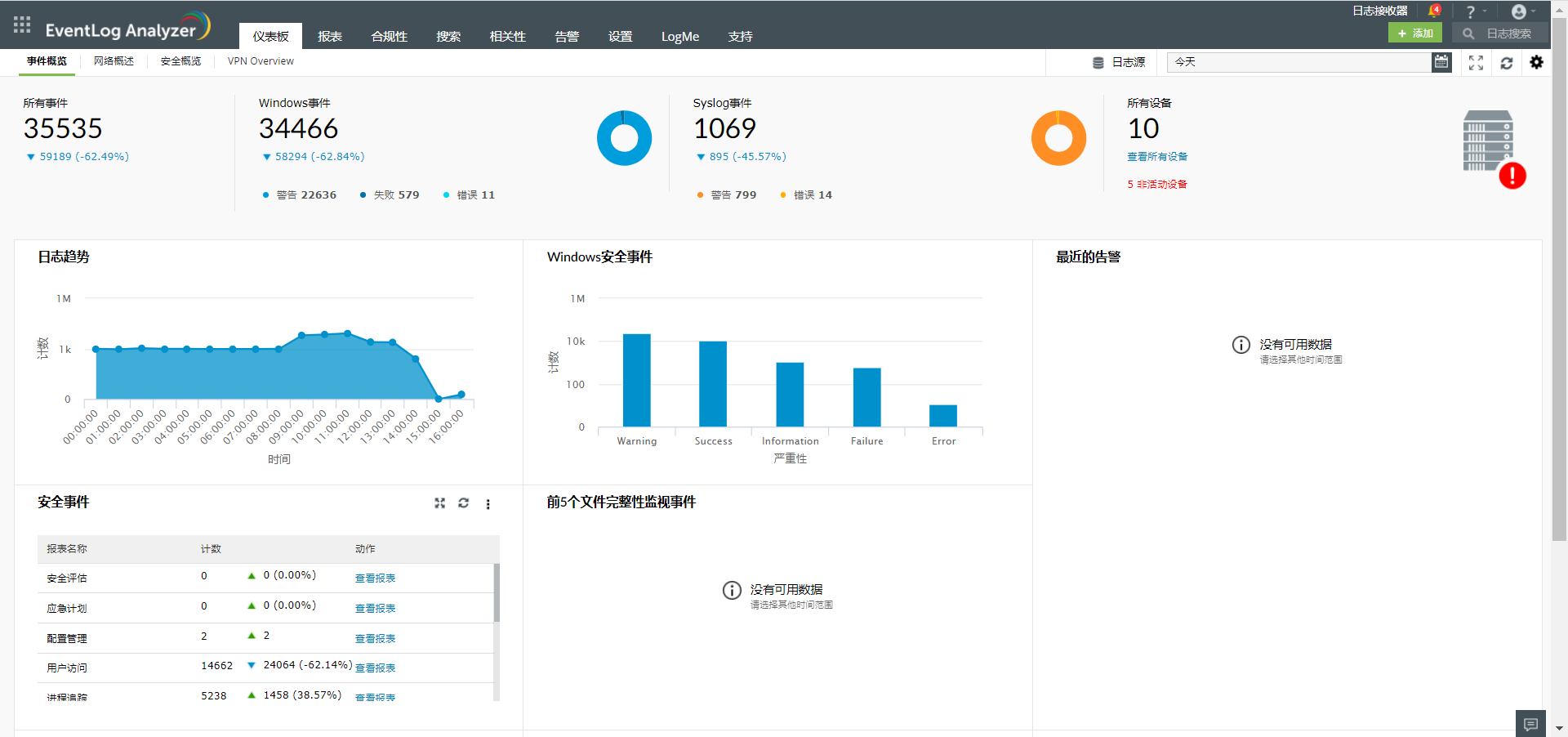 此标签通过生成图形报表(如日志趋势、系统日志严重性事件、Windows严重性事件和最近的告警)显示安全事件的高级概述。这些报表是针对在特定时间范围内发生的事件生成的(可以自定义)。将鼠标指针悬停在图表或图形上将提供有关特定设备的事件计数、其IP地址和事件严重性(信息、通知、调试、警告、告警、错误、严重和紧急)的信息。