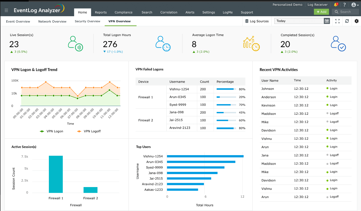 您可以通过点击到设置 → 添加标签 → VPN概览来自定义仪表板标签以包括VPN概述。EventLog Analyzer监控VPN会话活动并生成报表,帮助您可视化感兴趣的事件。VPN概览将通过显示实时会话计数、总登录小时数、平均登录时间、已关闭会话以及顶级用户和状态等部件,让您深入了解VPN用户和会话活动。您还可以分别通过设置 → 添加部件和设置 → 重新排序部件来添加和重新排序部件,从而自定义VPN仪表板。