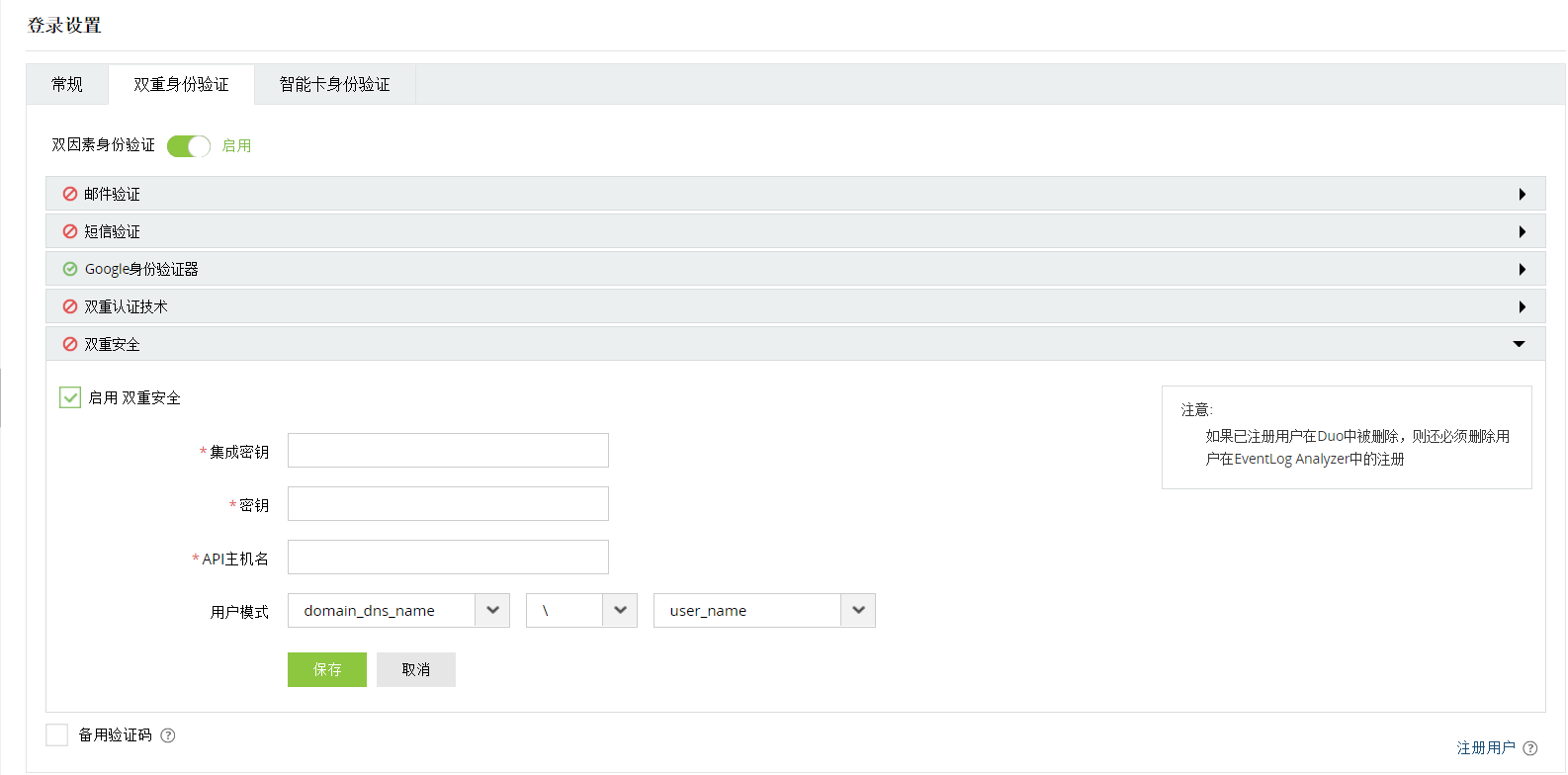 - 在EventLog Analyzer两因素身份验证菜单中,勾选启用Duo Security,然后在适当的字段中输入记录的值。