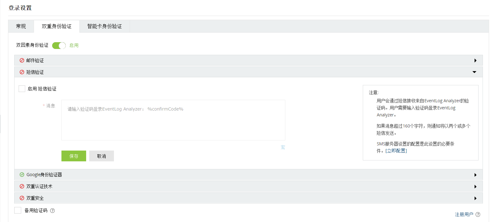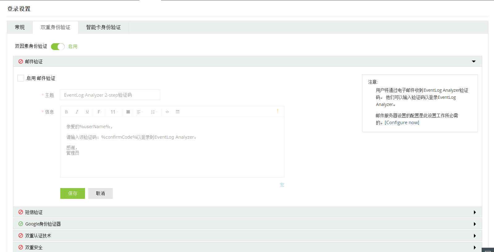 为了增强登录安全性,EventLog Analyzer支持双因素身份验证(TFA)。