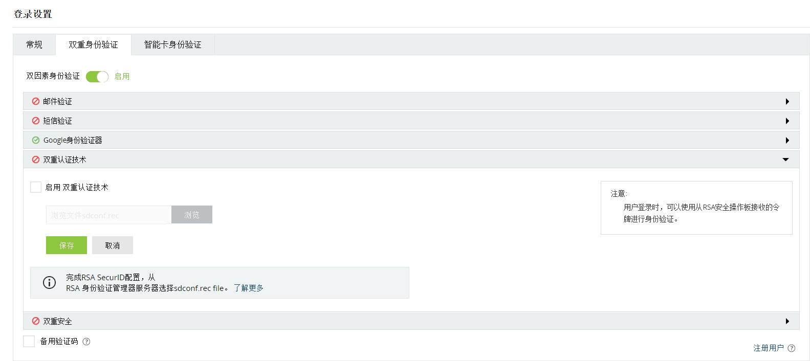 启用RSA SecurID验证后,需要输入RSA SecurID移动应用程序生成的安全代码、硬件令牌或通过邮件或SMS接收的令牌才能成功登录。