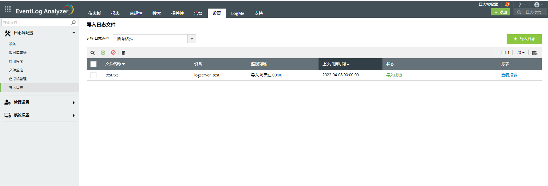 在导入的日志文件页面中,将会显示EventLog Analyzer监视的所有导入的日志文件。页面中提供了导入的日志文件的详细信息,包括: