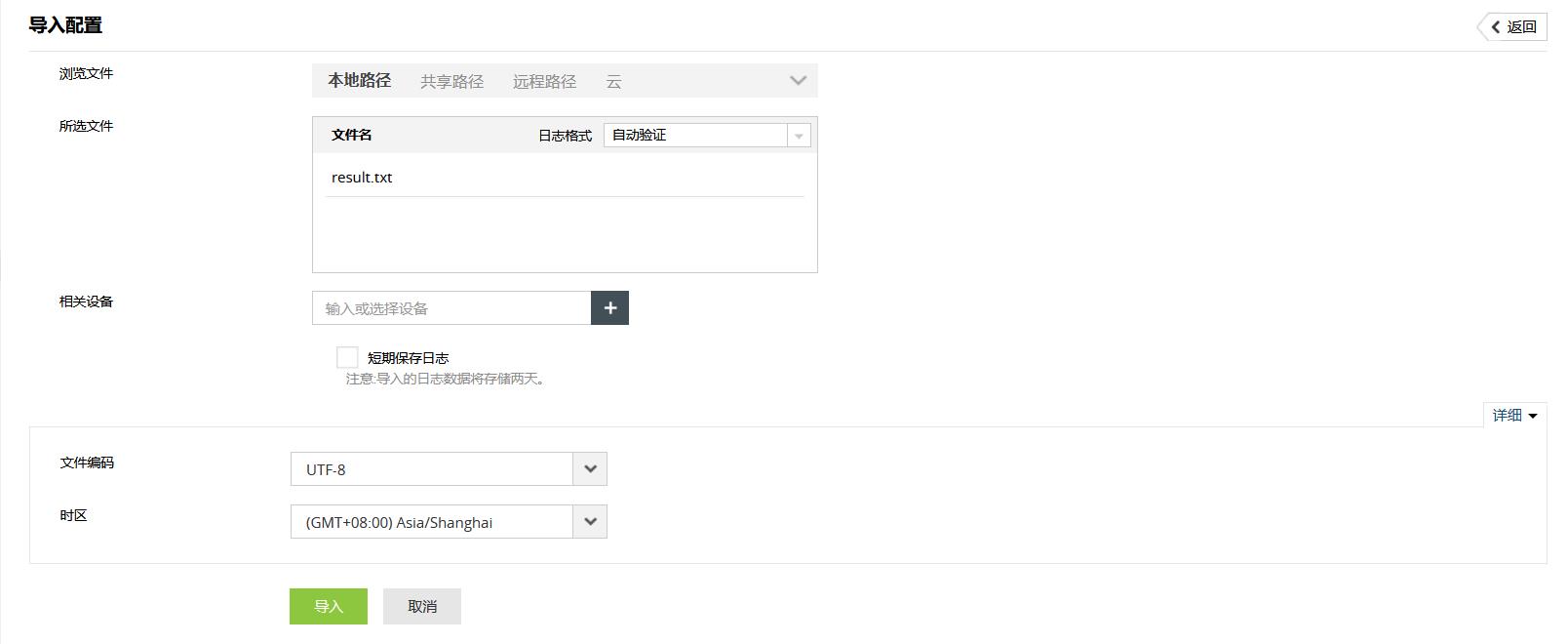 选择要导入的日志文件后,点击高级以选择导入日志的编码类型和时区。