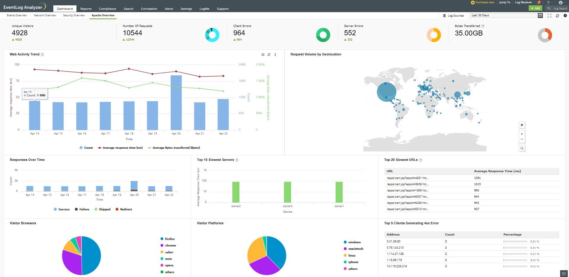 EventLog Analyzer 帮助您收集和分析来自服务器、网络设备和应用程序等不同来源的日志。该解决方案提供可操作的情报,帮助安全团队随时掌握组织中的安全威胁。