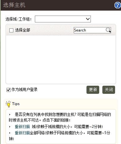 使用选择全部来选择列出工作组或域中的所有主机。或者使用搜索栏来搜索主机,从搜索结果中选择你要的主机。