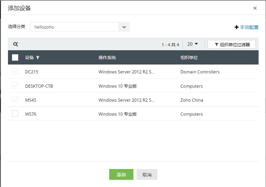 注意: 您可以选择通过点击选择域下拉窗口旁边的相应图标来更新、重新加载和删除工作组。或者,您也可以通过点击手动配置链接手动添加设备,如下所示。