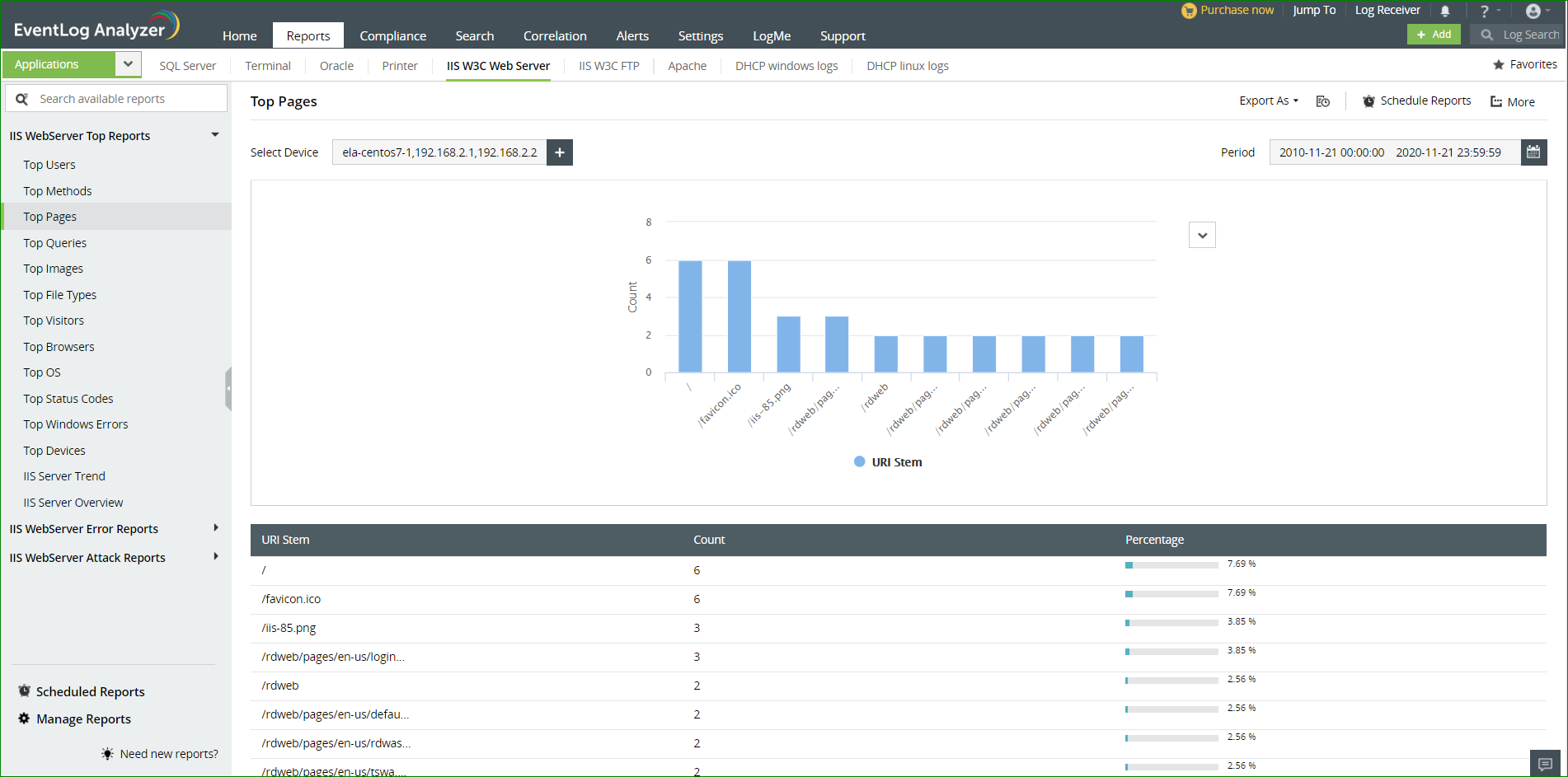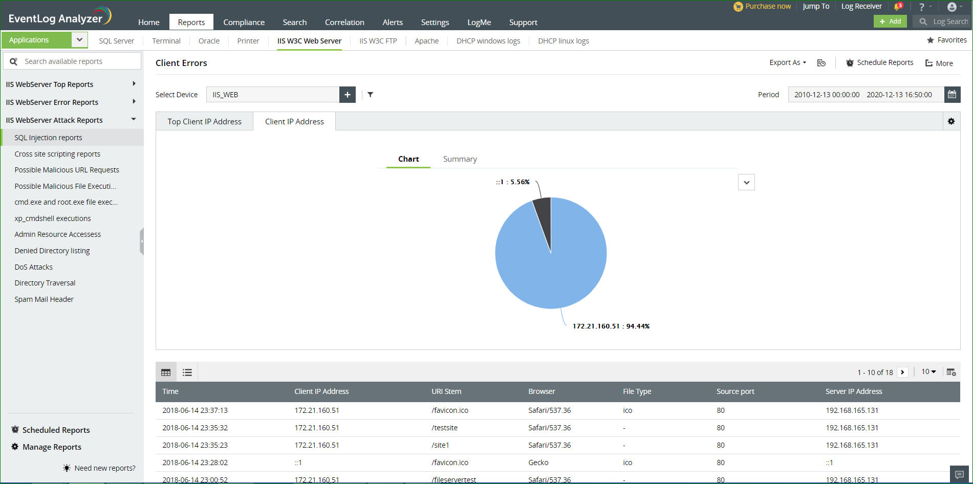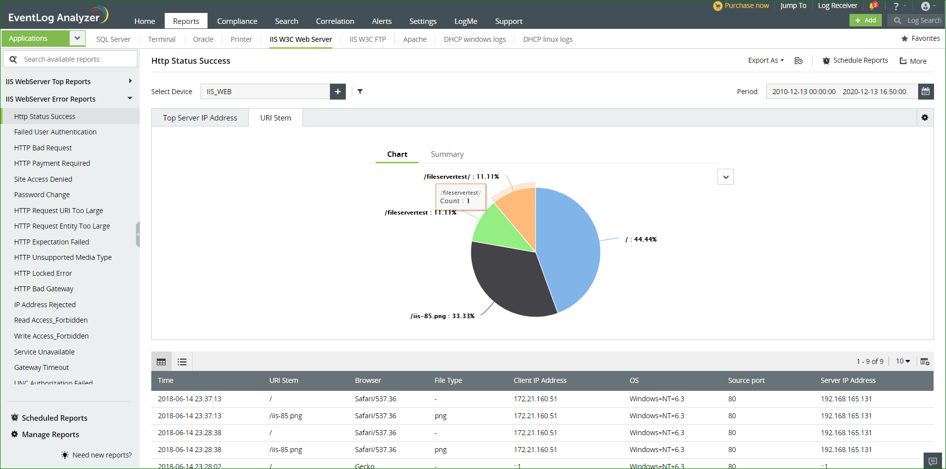 EventLog Analyzer是理想的Web服务器审核工具,可帮助您以自动化,高效的方式筛选大量日志。该解决方案也是出色的管理工具和监视工具。作为 日志管理软件,它可以根据计划自动导入IIS Web服务器日志,从而帮助您管理IIS Web服务器,帮助您对其进行分析,搜索和自动存档。该工具通过生成预定义的报表和有关服务器使用情况,错误以及任何攻击尝试的告警来辅助IIS Web服务器日志监视。