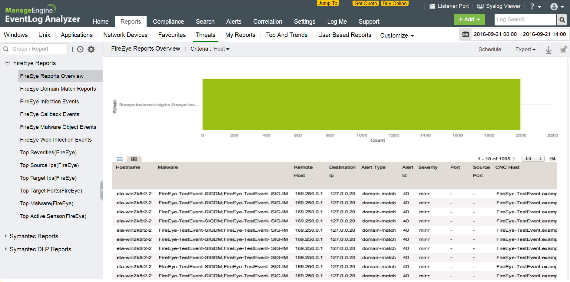 支持的威胁情报应用:EventLog Analyzer将来自威胁情报应用程序(例如,FireEye和Symantec Endpoint Protection)的安全信息整合到一个集中位置。