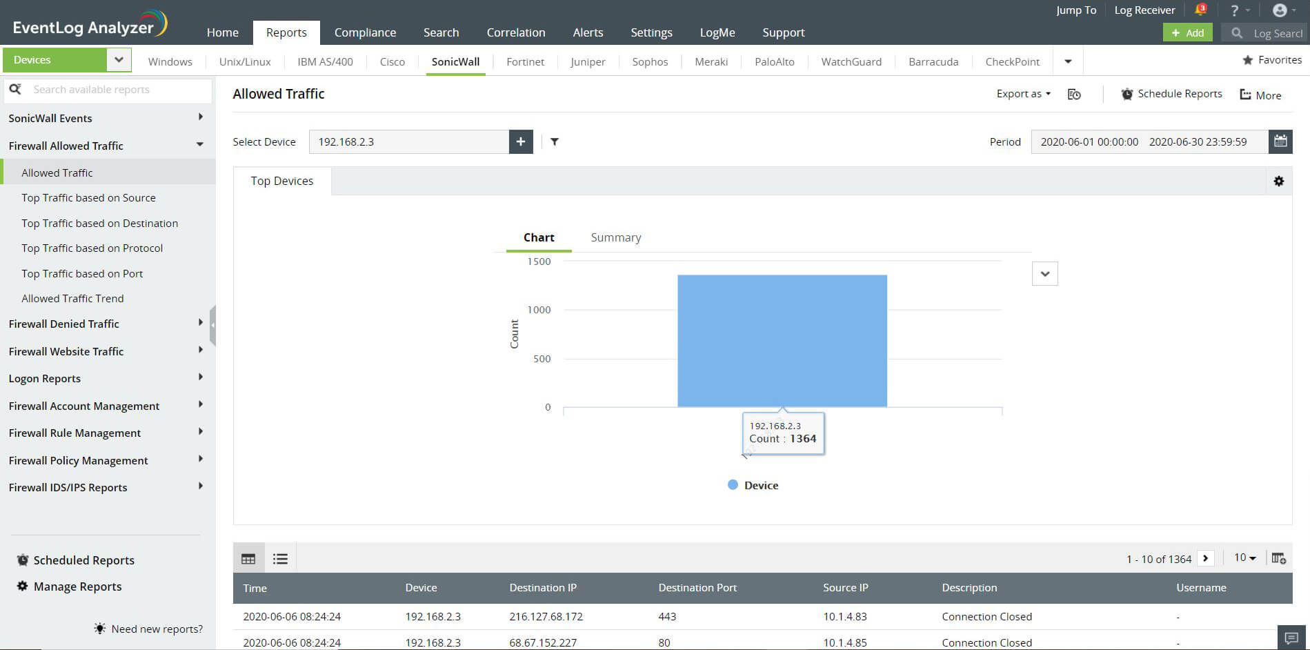 借助EventLog Analyzer提供的SonicWall流量报表,您可以轻松地关注网络的每个角落。这些报表使您可以可视化网络流量的行为模式,并显示与流量相关的重要数据。一些最常用的数据是: