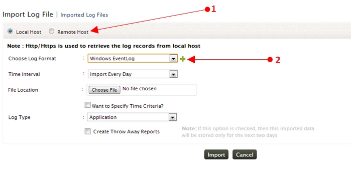 Use the Local Host option to import the log files from the local machine, from where you are accessing EventLog Analyzer over the web. The maximum log file size for import from local host is 1 GB. Use the Remote Host option to import the log files from remote machines. The maximum log file size for import from remote host is 2 GB